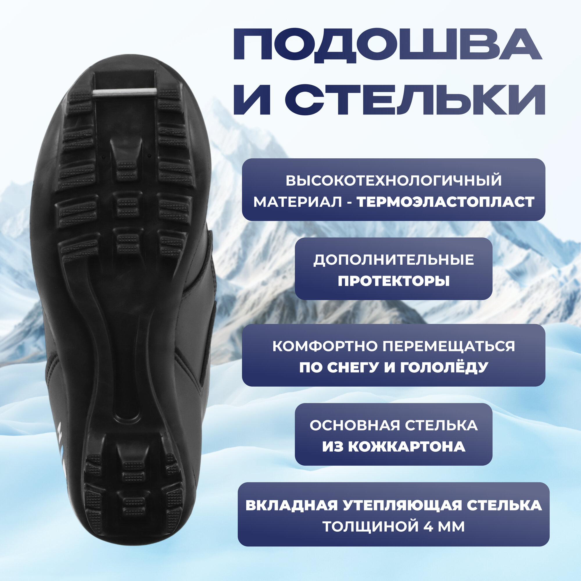 | Особенности | анатомическая стелька / влагонепроницаемые / защитный клапан / на липучках |