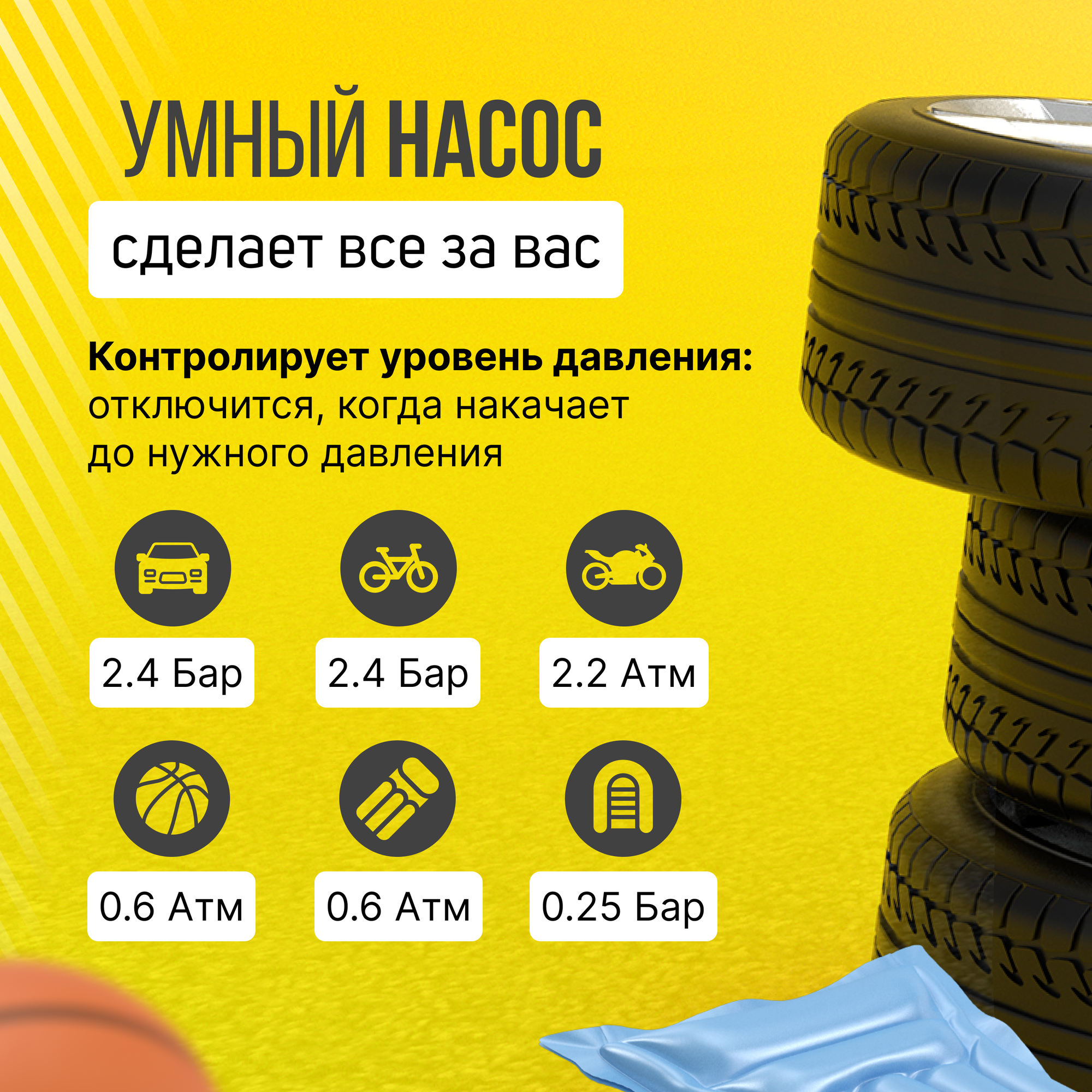 Отзывы на Автомобильный компрессор насос от прикуривателя ДОМ ХИТ, Поддержка 4 единиц давления, компактный, автоотключение