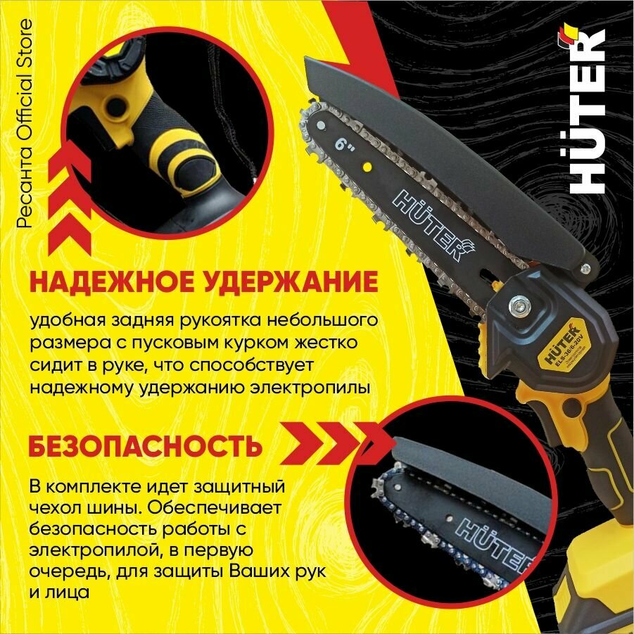 Электропила аккумуляторная ELS-36/6-20V Huter - АКБ Li-On, 2000 mAh, компактная и легкая, для деревьев и веток хутер информация: