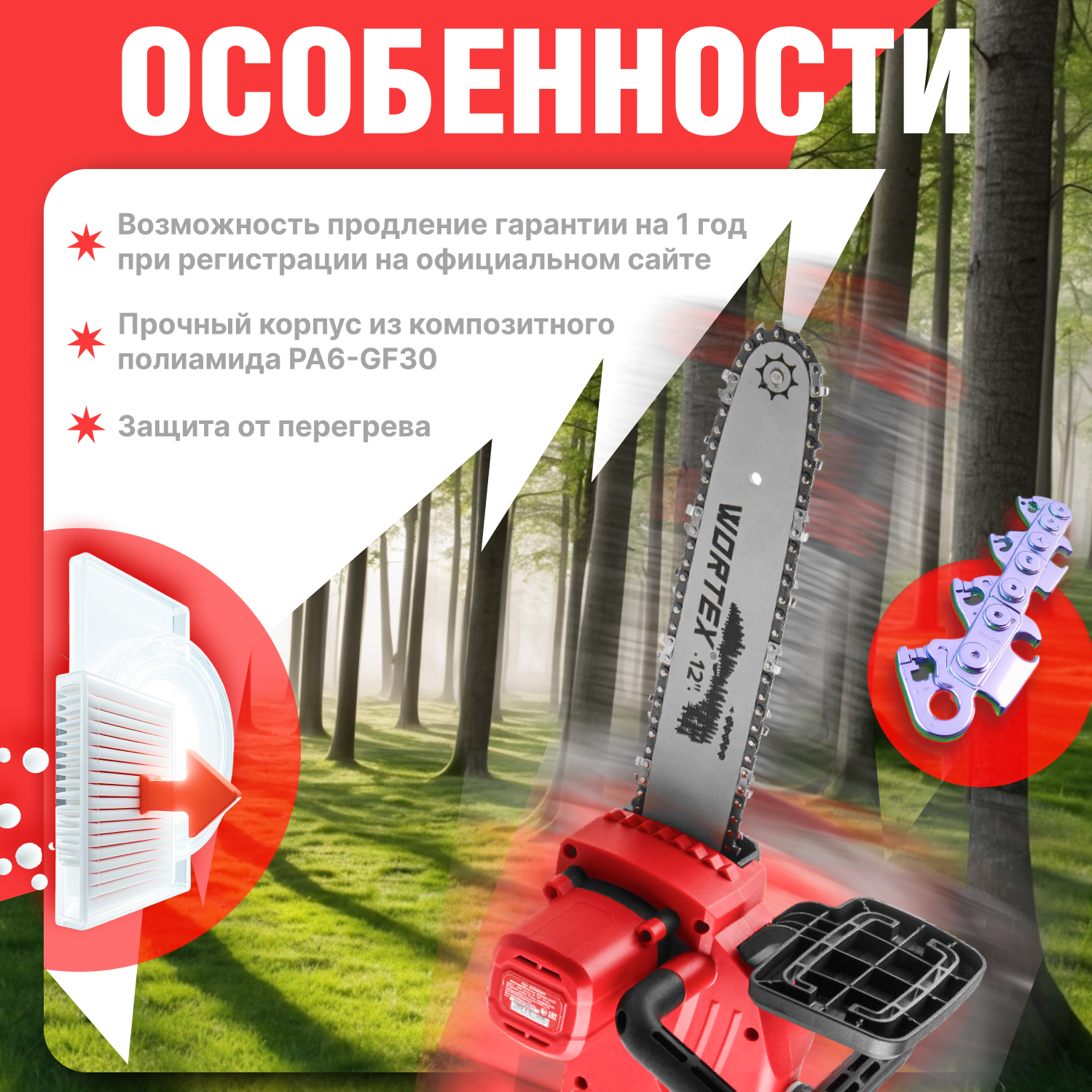 | Особенности конструкции | бесключевая замена оснастки, регулировка натяжения цепи без инструмента |