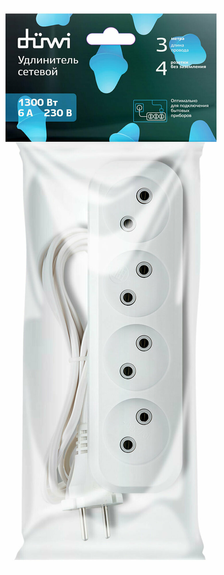 Удлинитель duwi, 4 розетки, 3-метровый кабель ШВВП, максимальная нагрузка 1300Вт, белый информация: