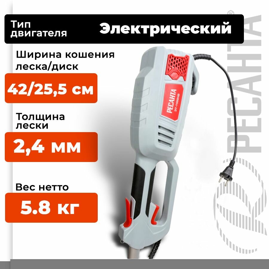 Электрический триммер ЭТ-1500НВ Ресанта ( 1500 Вт, 8000 об/мин, скашивание леской 42 см, ножом 25,5 см; диаметр лески 2мм; с плавным пуском и велосипедной рукояткой