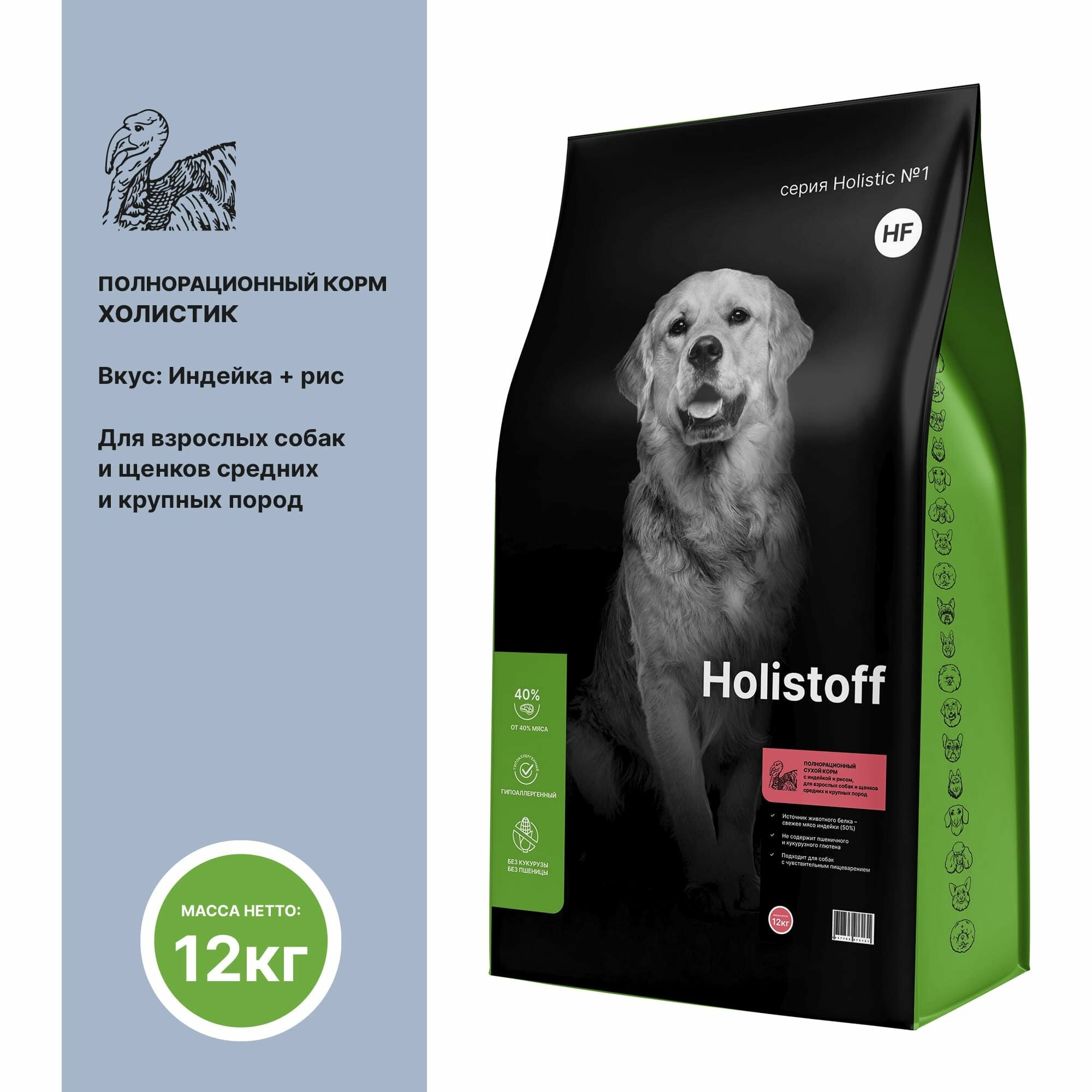 HOLISTOFF Сухой корм индейка и РИС для взрослых собак и щенков средних и крупных пород, 12кг
