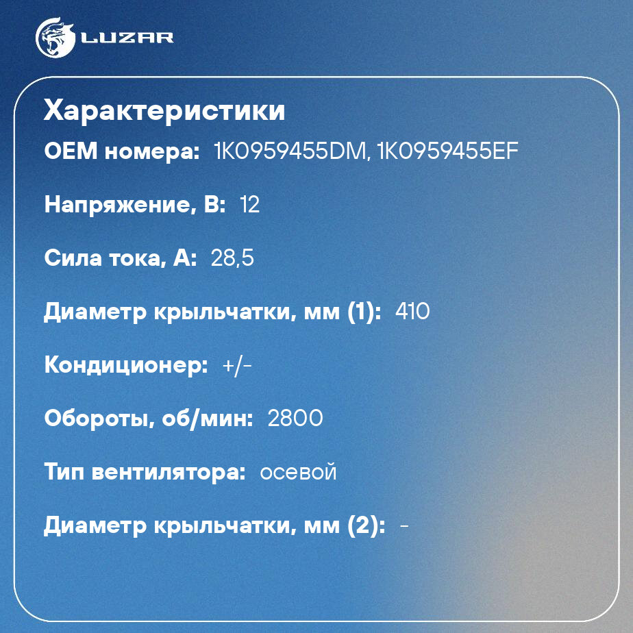 Вентилятор охлаждения двс VAG Octavia (A5) 04- 1.4i , Golf 03-, Passat 05- (400W; 410 мм) Luzar 10 514 ₽