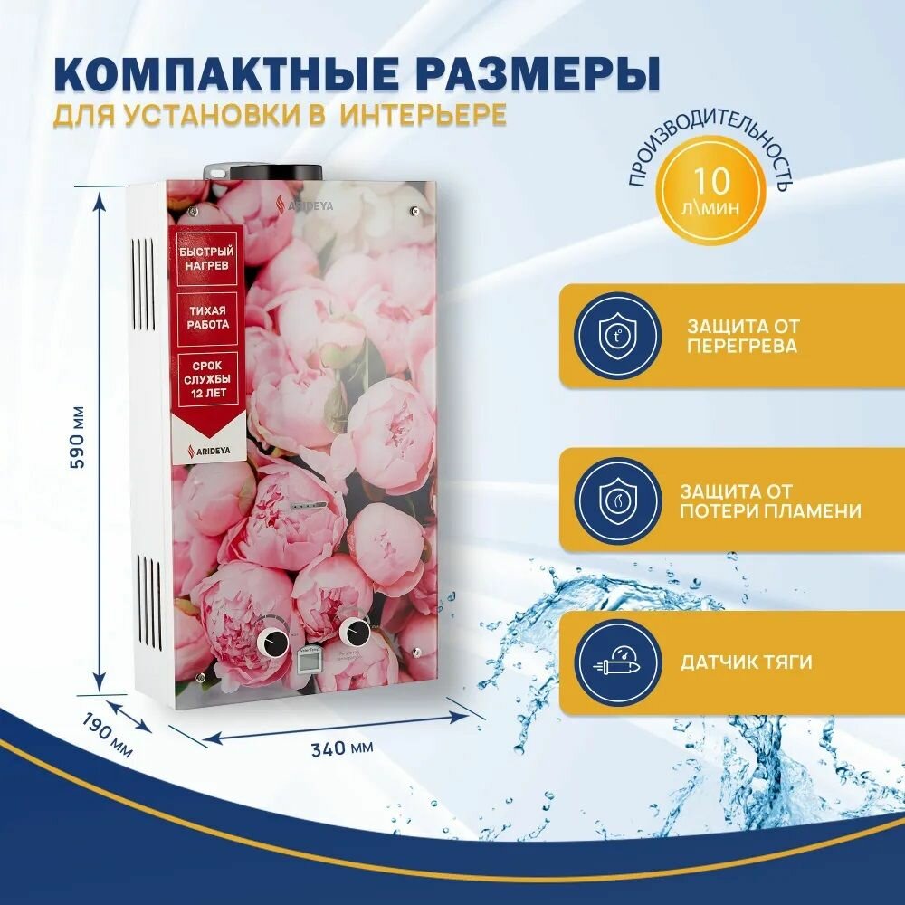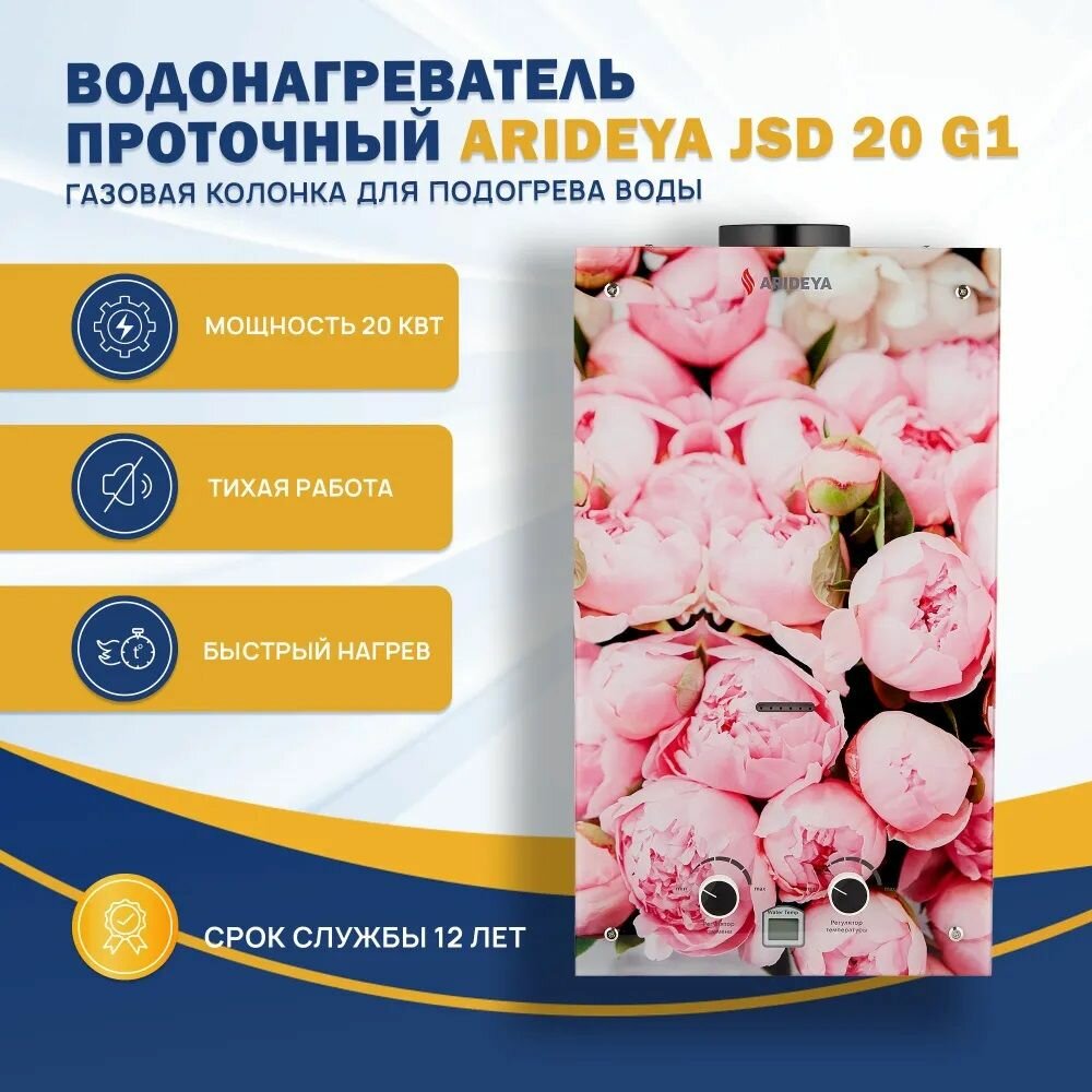 Водонагреватель газовый проточный Arideya JSD 20 G1 (P) (Пионы), колонка для подогрева воды информация: