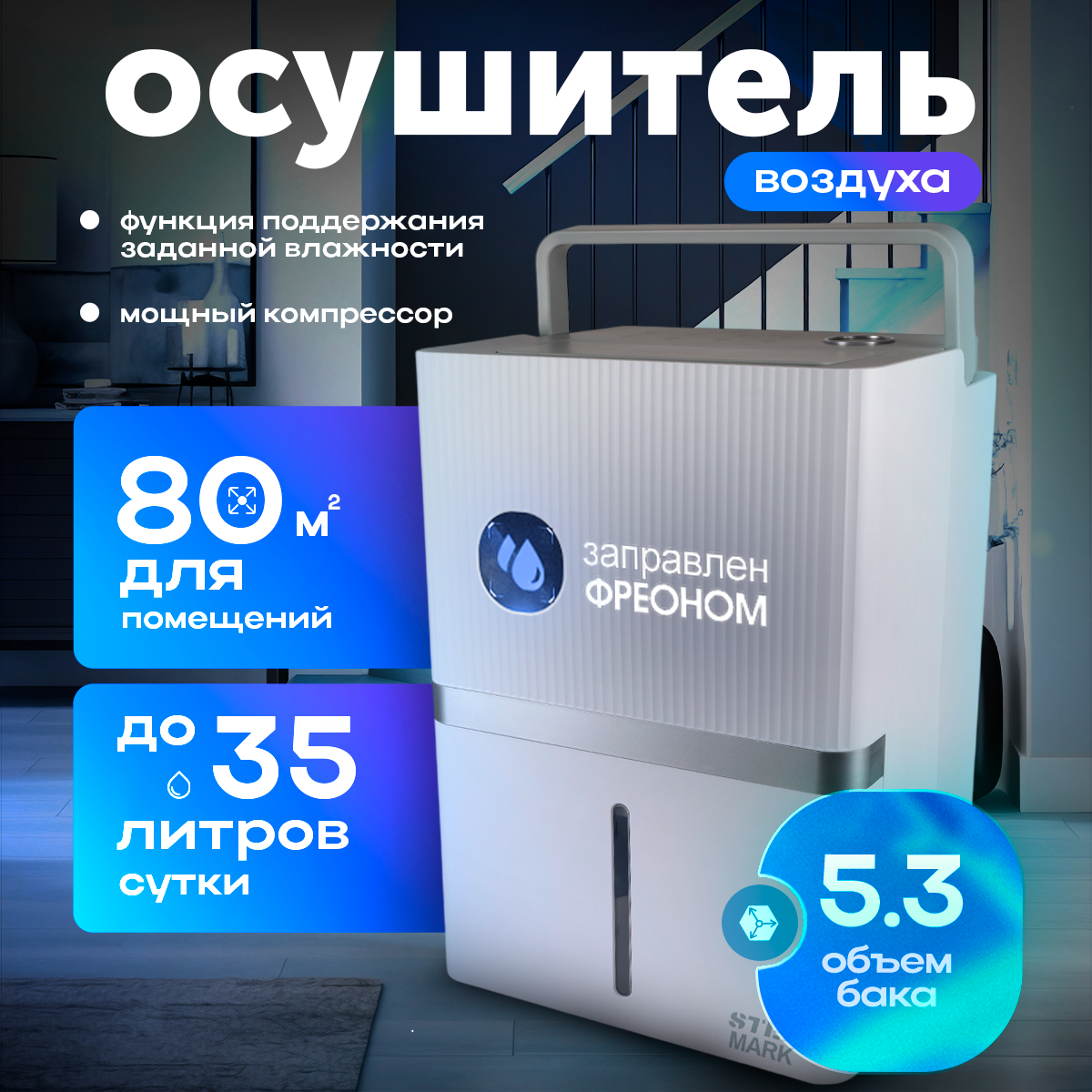 Осушитель воздуха бытовой для дома, квартиры и подвала 35 л для помещений до 80 кв.м информация: