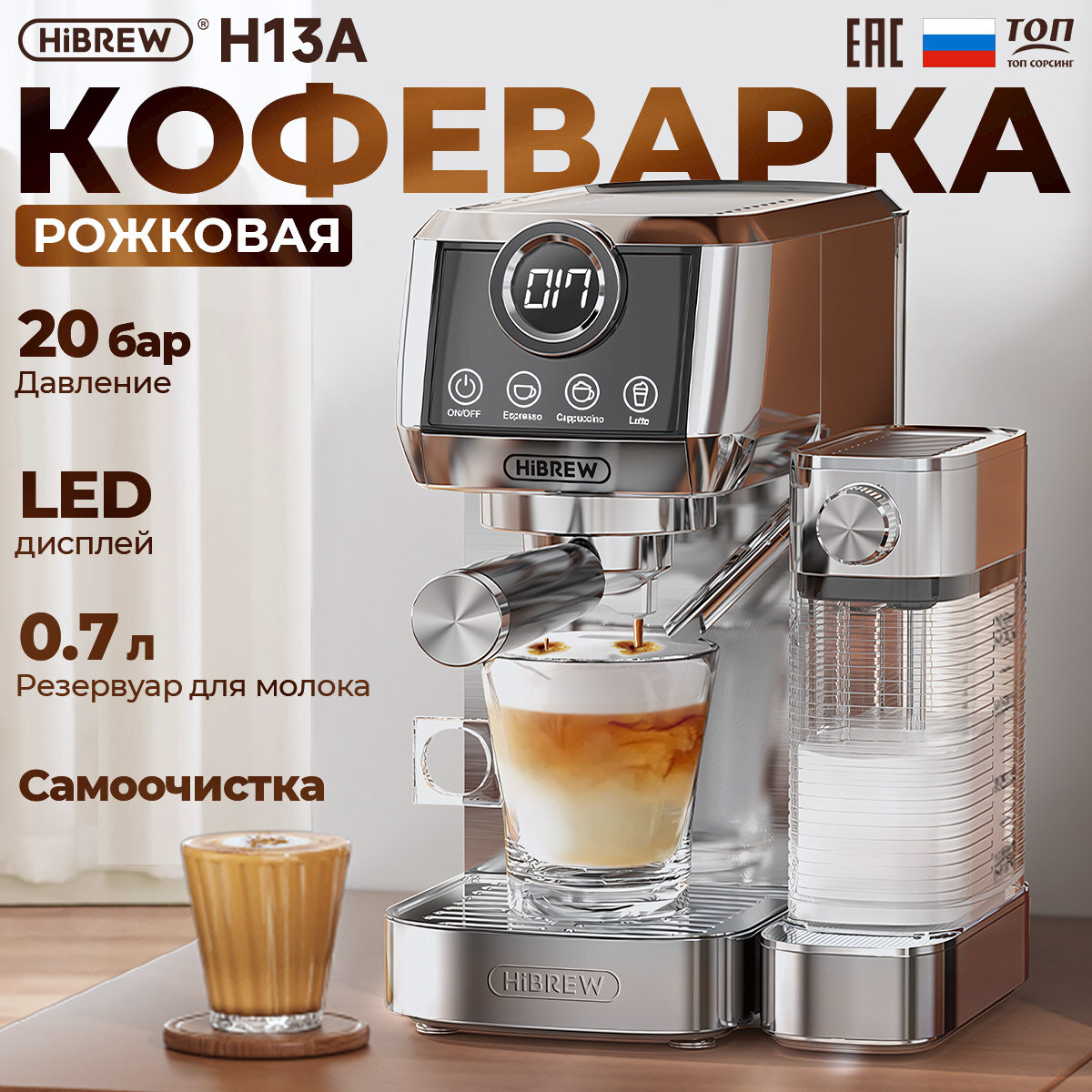 Автоматическая кофемашина HiBREW H8A(ЕАС-сертификат) для приготовления эспрессо, капучино, латте, 19 бар, 3 в 1