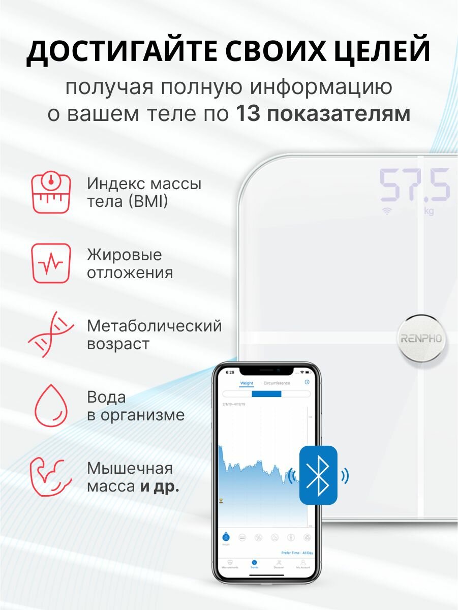 Весы напольные умные электронные Renpho Elis Aspire ES-BR001 стеклянные, с bluetooth и Wi-Fi подключением и функцией анализа 13 показателей тела, до 180 кг, белые информация: