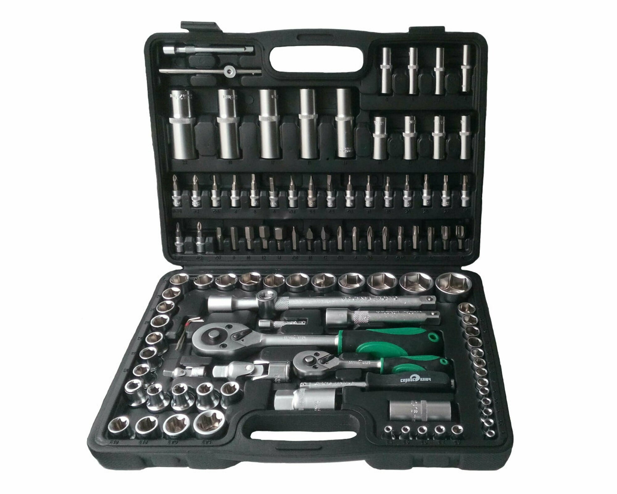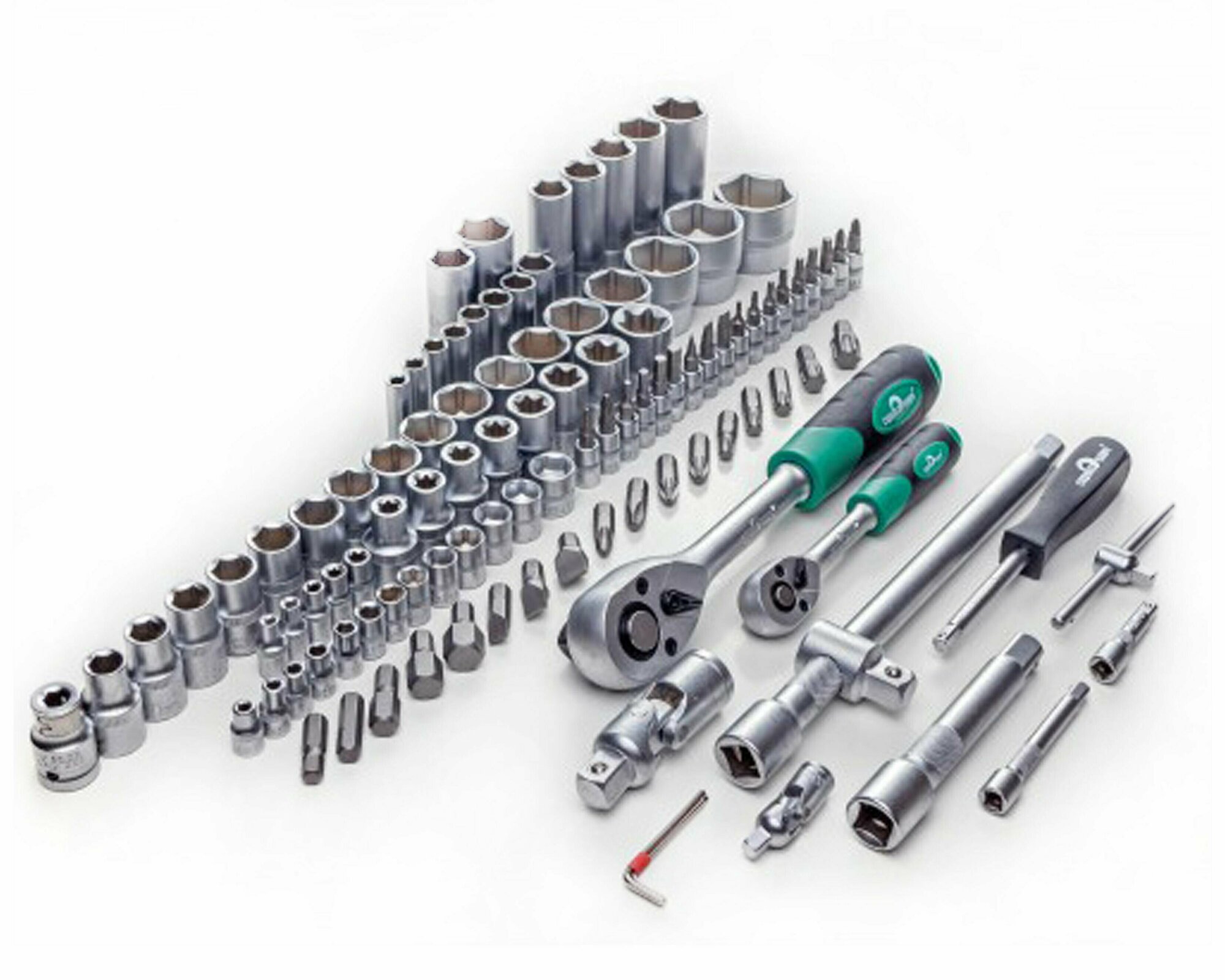 | Головки торцевые подробно | 1/4": 4, 4.5, 5, 5.5, 6, 7, 8, 9, 10, 11, 12, 13, 14 мм; глубокие (50 мм): 6, 7, 8, 9, 10, 11, 12, 13 мм; E-star: Е4, Е5, Е6, Е7, Е8; со вставками: SL4, SL5.5, SL6.5, PH1, PH2, PZ1, PZ2, HEX3, HEX4, HEX5, HEX6, Т8, Т10, Т15, Т20, Т25, Т27, Т30; 1/2": 10, 11, 12, 13, 14, 15, 16, 17, 18, 19, 20, 21, 22, 24, 27, 30, 32 мм; глубокие 6-гр. (75 мм): 14, 15, 17, 19, 22 мм; E-star: Е10, Е11, Е12, Е14, Е16, Е18, Е20, Е22; свечные: 16, 21 мм |