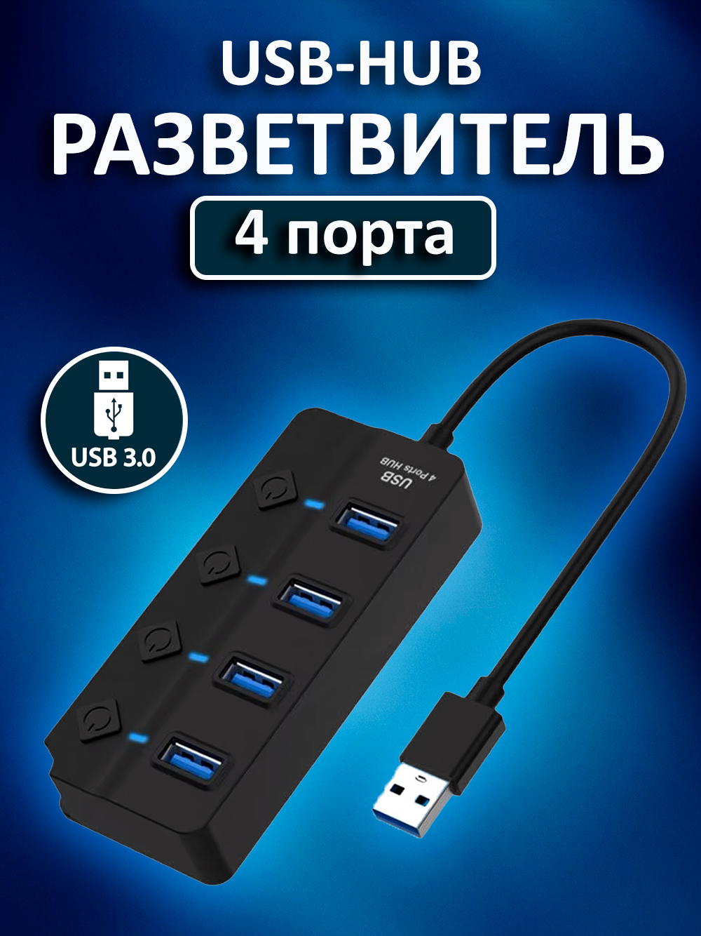 HUB USB 1.2 метра / USB-ХАБ / разветвитель / USB-hub 4 порта / HUB USB для периферийных устройств / Чёрный
