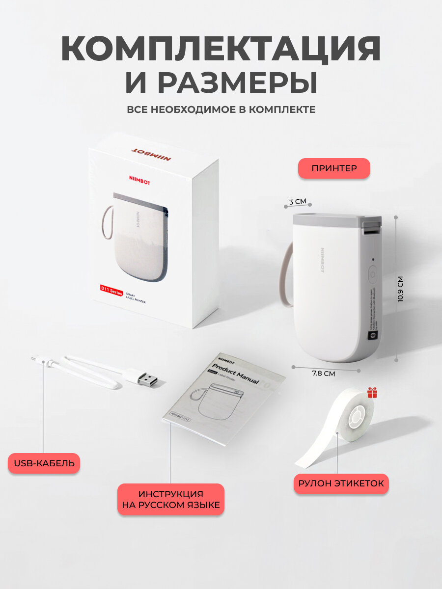 Термопринтер для этикеток Niimbot D11 беспроводной, портативный, белый информация: