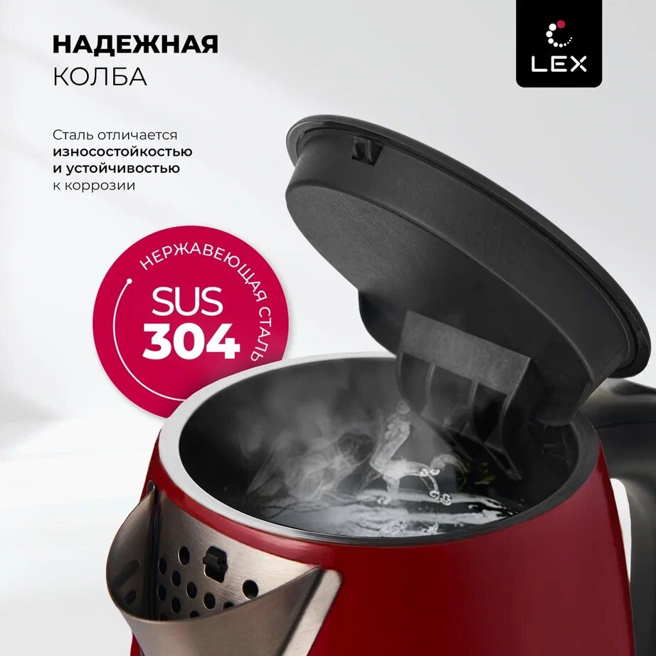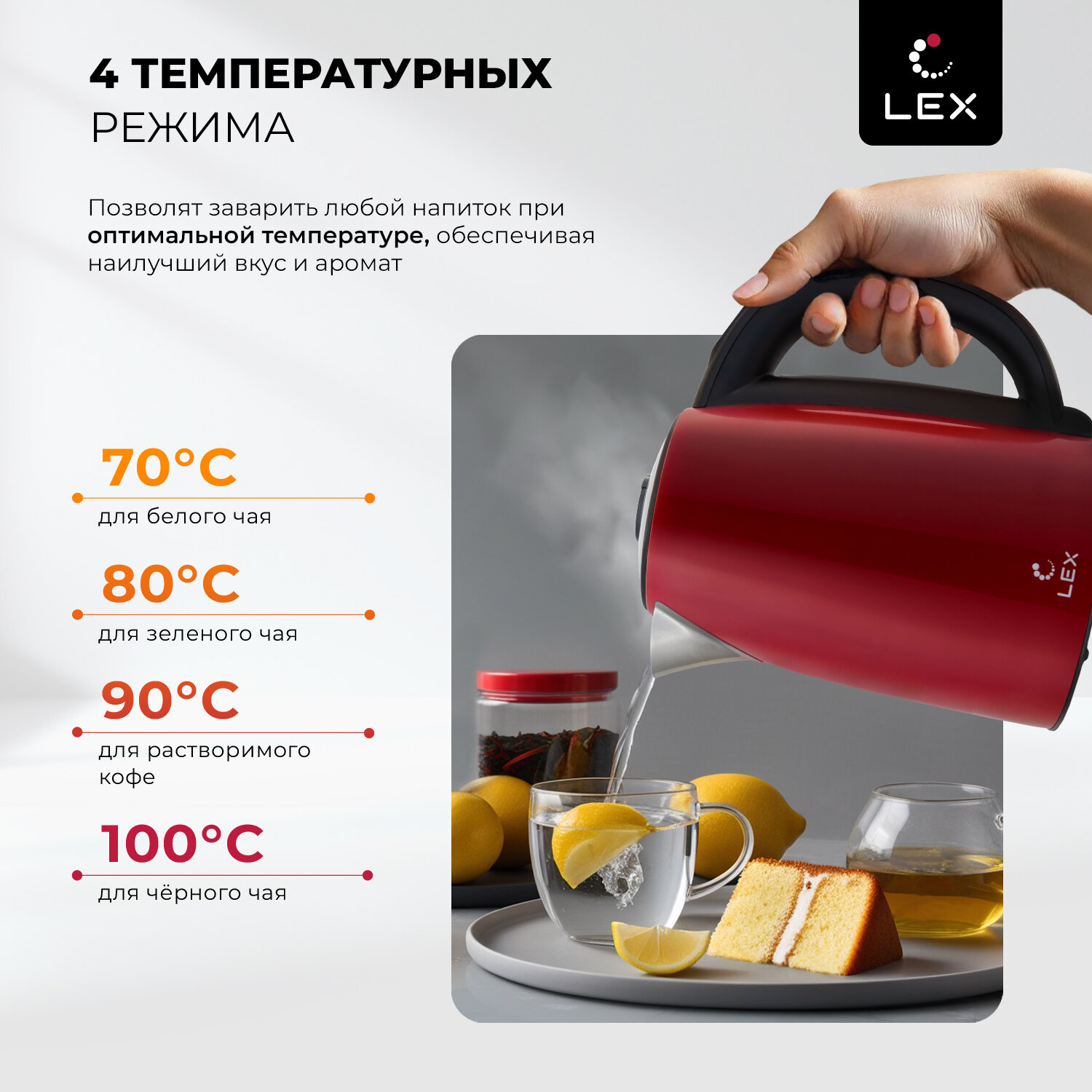 Электрический чайник LEX LX 30021-2, материал кувшина - пищевая сталь SUS304, объем 1,7л, 4 режима нагрева и поддержания температуры воды, блокировка включения без воды, защита от перегрева. информация: