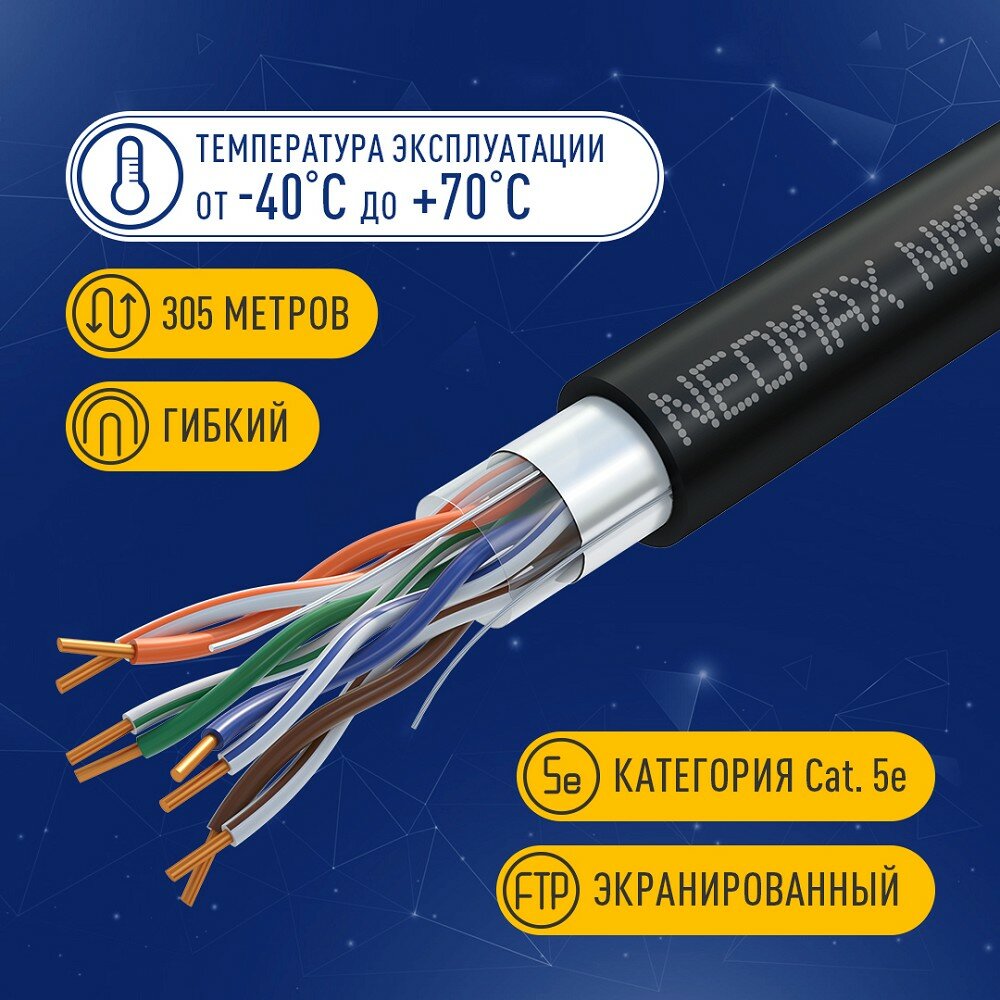 Кабель Neomax Кабель FTP 5e кат. Neomax NM20031, 4 пары, однож., 24AWG/0.51мм, медь (305м), наружный, черный 19 640 ₽