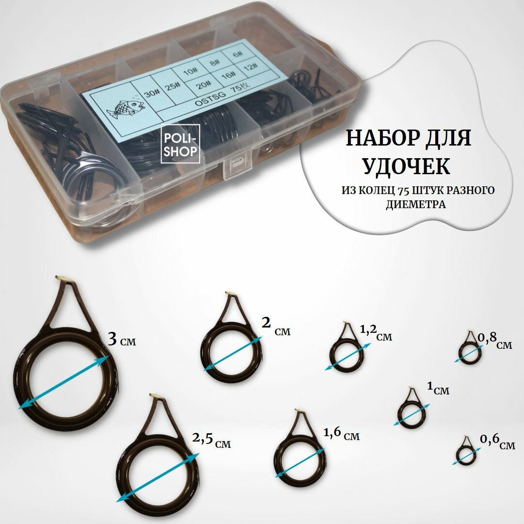 Кольца для удочек / Кольца для спиннинга / Комплект колец для рыбалки / Набор OSTSG 75 штук от 0.6см до 3см черные