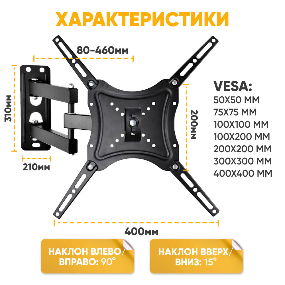10 цен на Кронштейн для ТВ LED/LCD телевизора 14-55 до 20 кг дюймов наклонно-поворотный (VESA 100x100,200x100,200x200,100x200) мм
