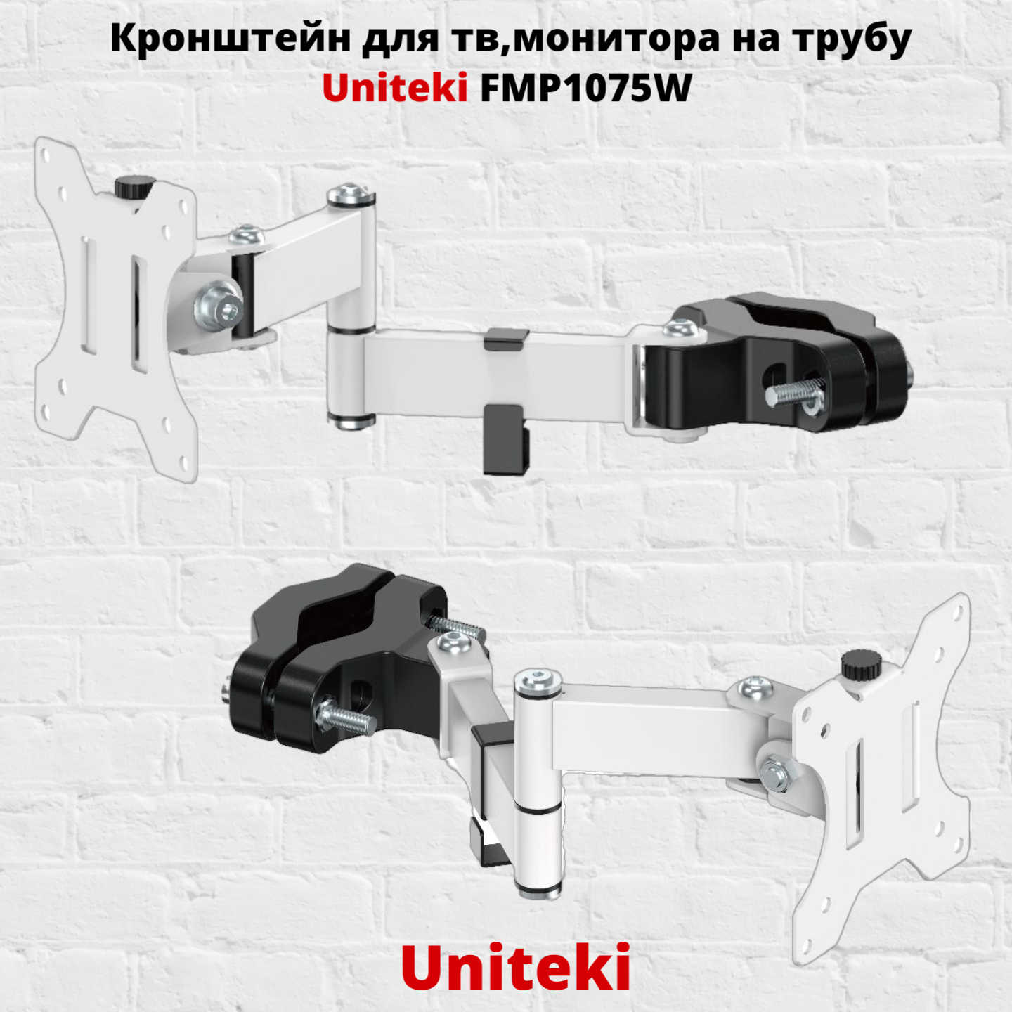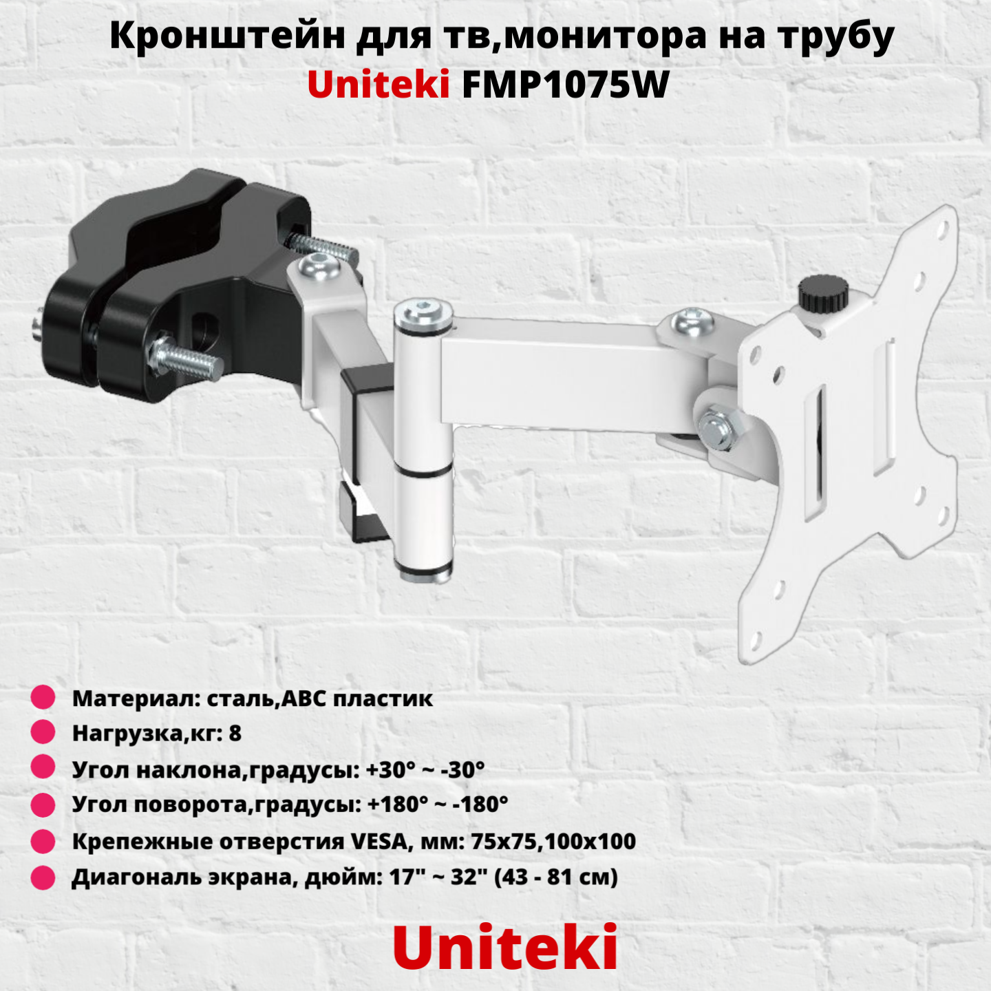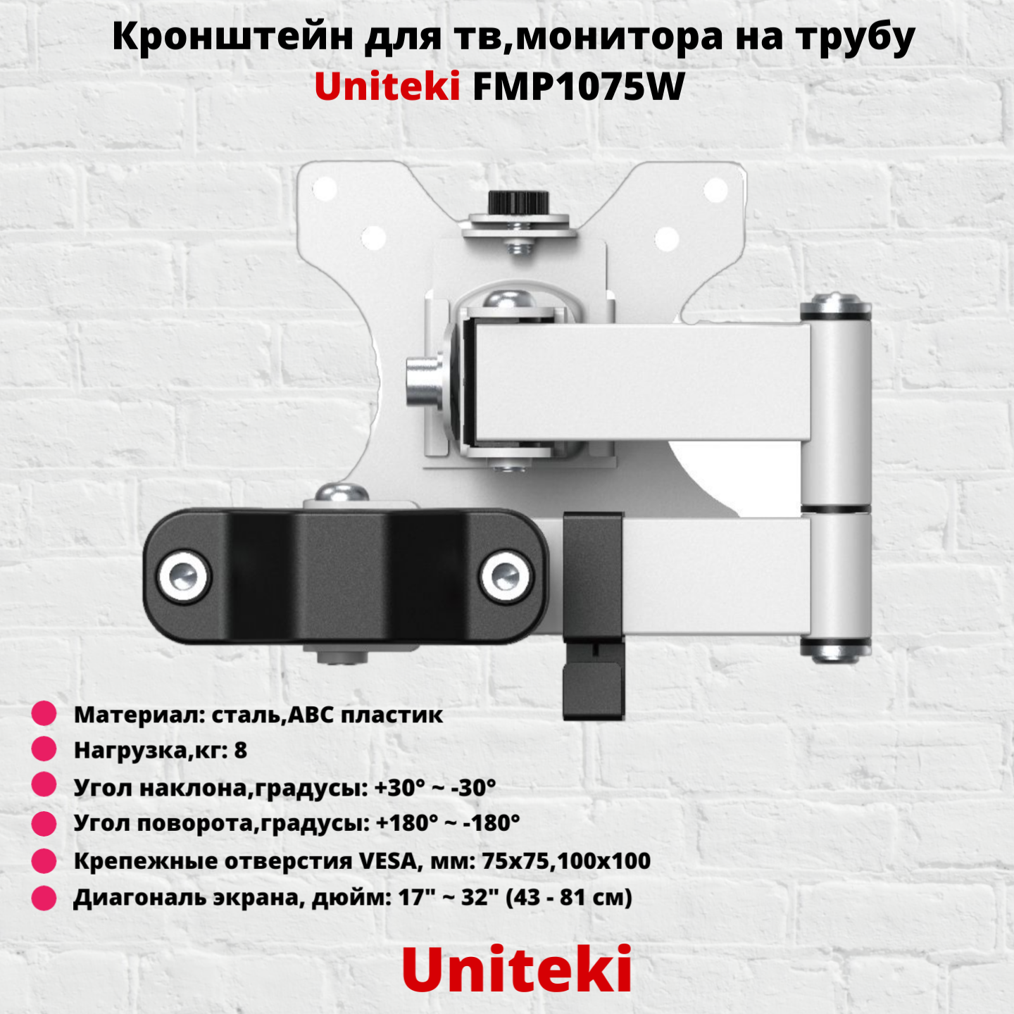 10 цен на Крепление кронштейн на трубу для монитора или телевизора диагональ 17-32 дюйма UniTeki FMP1075W белый наклонно поворотный быстросъемный