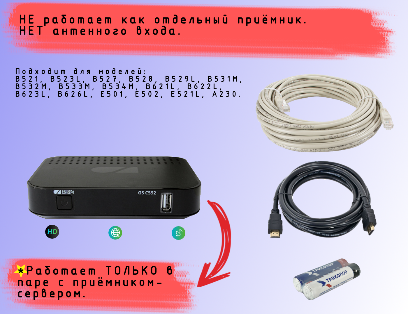 Спутниковая приставка-клиент Триколор GS C592 со встроенным Wi-Fi+HDMI 1,5м+батарейки+патч-корд (10 метров) информация: