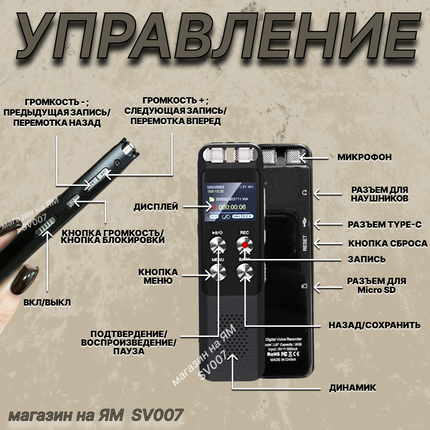 Отзывы на Цифровой диктофон со встроенным динамиком и дисплеем SV-04, встроенная память 8GB и внешняя 64 GB памяти, датчик звука, запись по таймеру, мониторинг, металлический корпус
