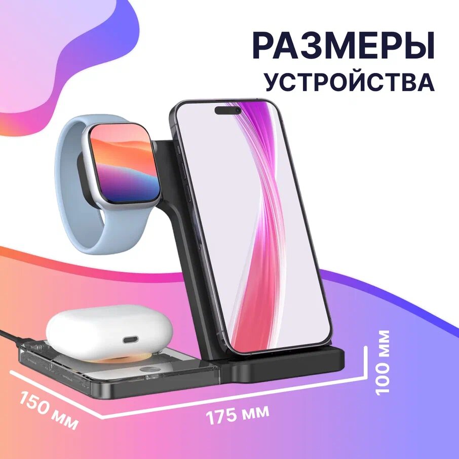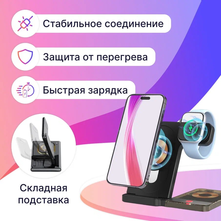 Беспроводная зарядка 5 в 1 для телефона iPhone / Зарядное устройство MagSafe 15W на Айфон / Черная информация: