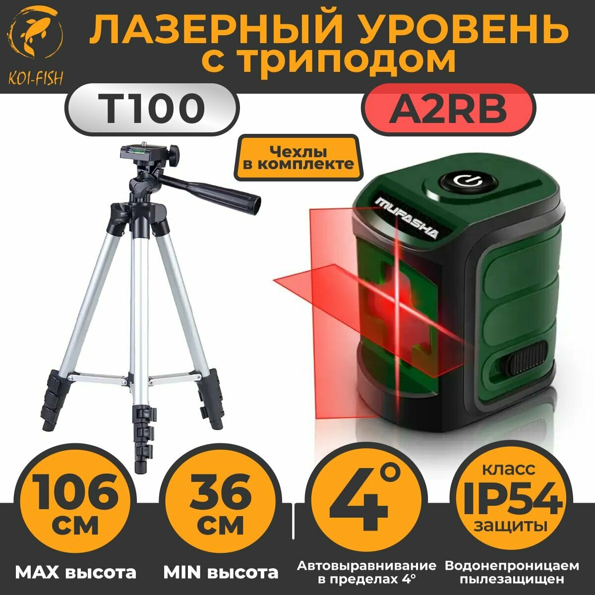 Лазерный уровень с треногой, штативом, нивелир 2 лазерных луча (A2RB красный+T100_серый) MUFASHA информация: