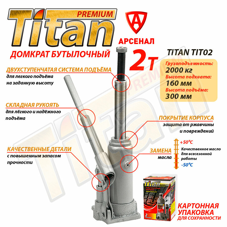 Домкрат гидравлический бутылочный Titan 2т/ Домкрат автомобильный 2 тонны, TIT02 информация: