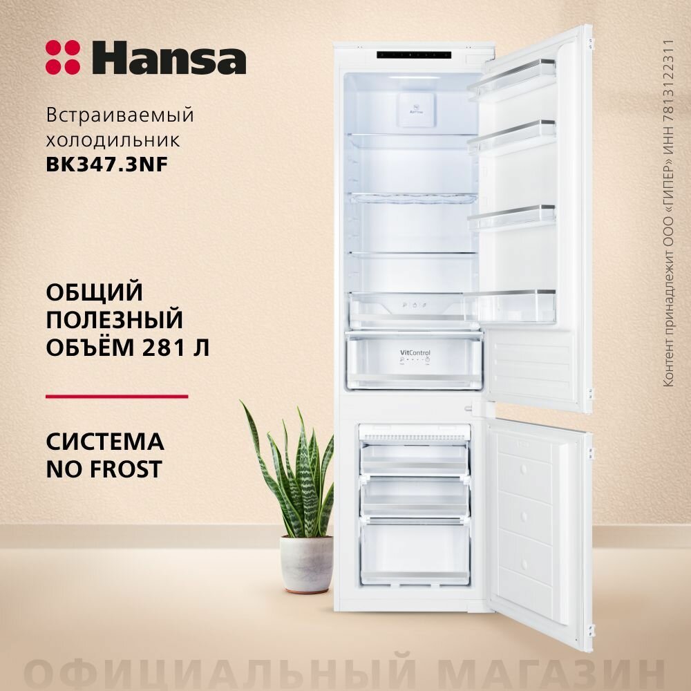 Встраиваемый холодильник Hansa BK347.3NF, 281 л, No Frost в морозильной камере, 40 дБ, автономное сохранение холода 18 часов, материал полок - стекло, А+, белый 71 991 ₽