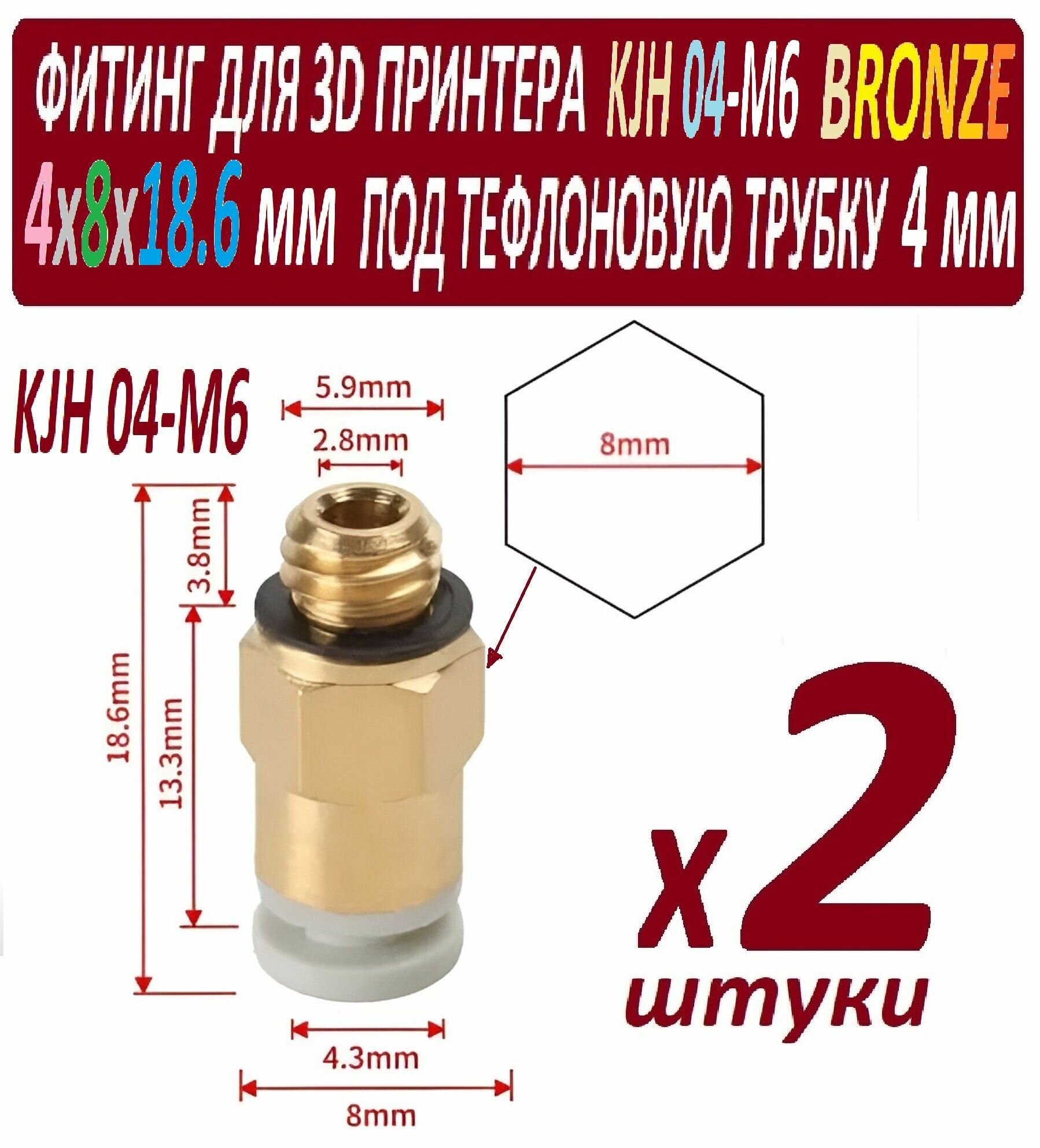 Фитинги KJH 04-M6 Bronze для 3D принтера под тефлоновую трубку 2х4 мм - 2 штуки информация: