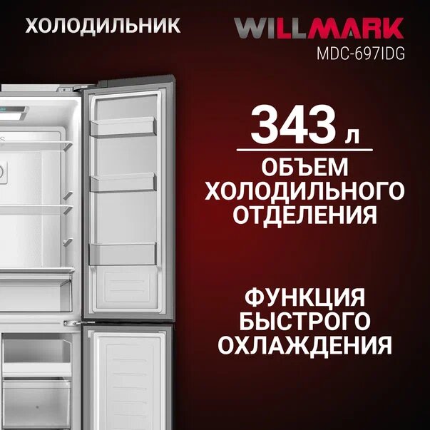 Холодильник Willmark MDC-697IDG, А+, side-by-side, No Frost, 517 л, дисплей, инверторный компрессор, функция быстрой заморозки, серебристый 92 690 ₽