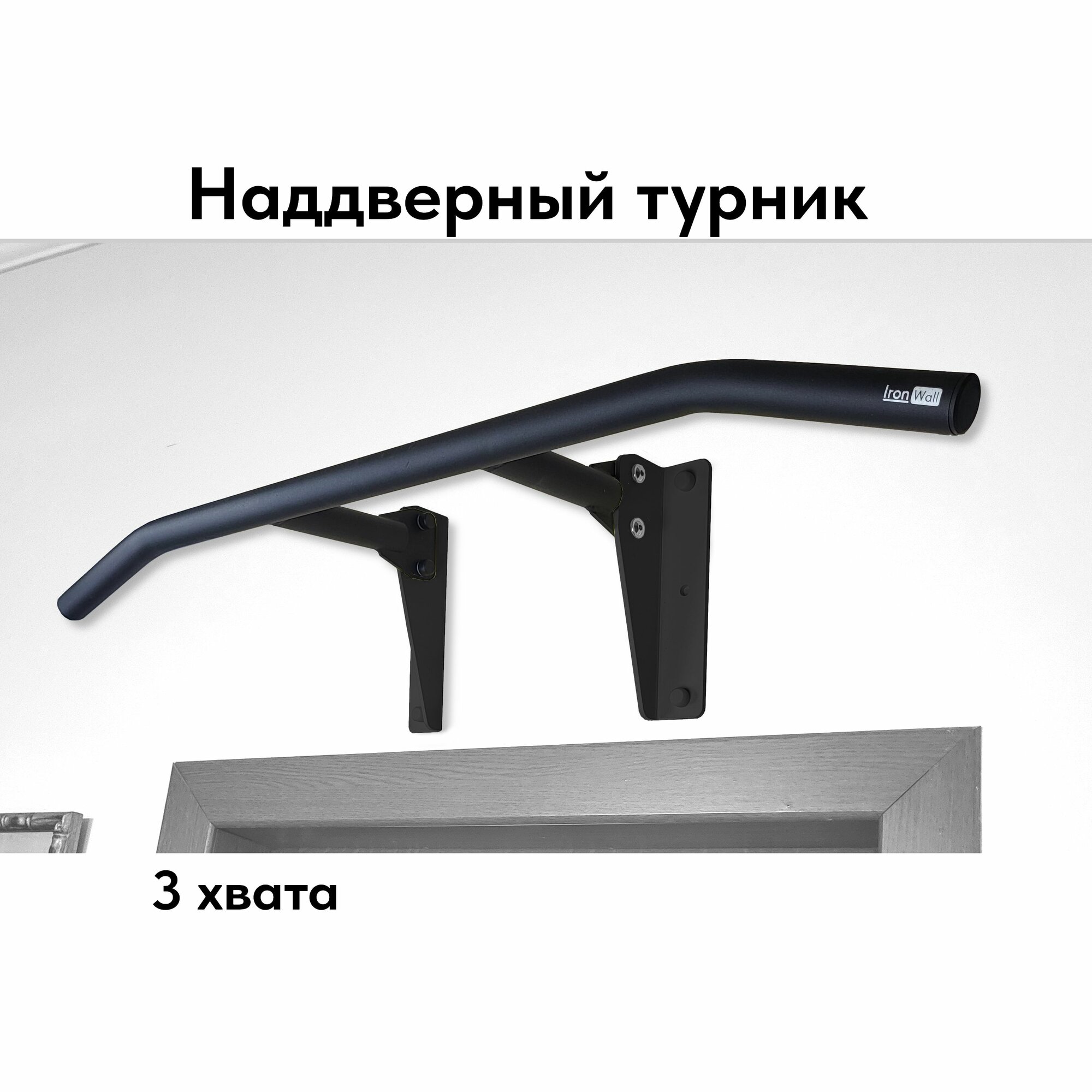 Турник наддверный IronWall PRO модель D1 4-00 c чёрной перекладиной для трех видов хвата и чёрными кронштейнами крепления к стене информация: