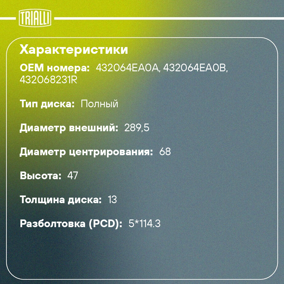 Диск тормозной Nissan Qashqai II (13-)/X-Trail T32 (14-) зад. d=290 (TRIALLI) 1шт. 3 742 ₽