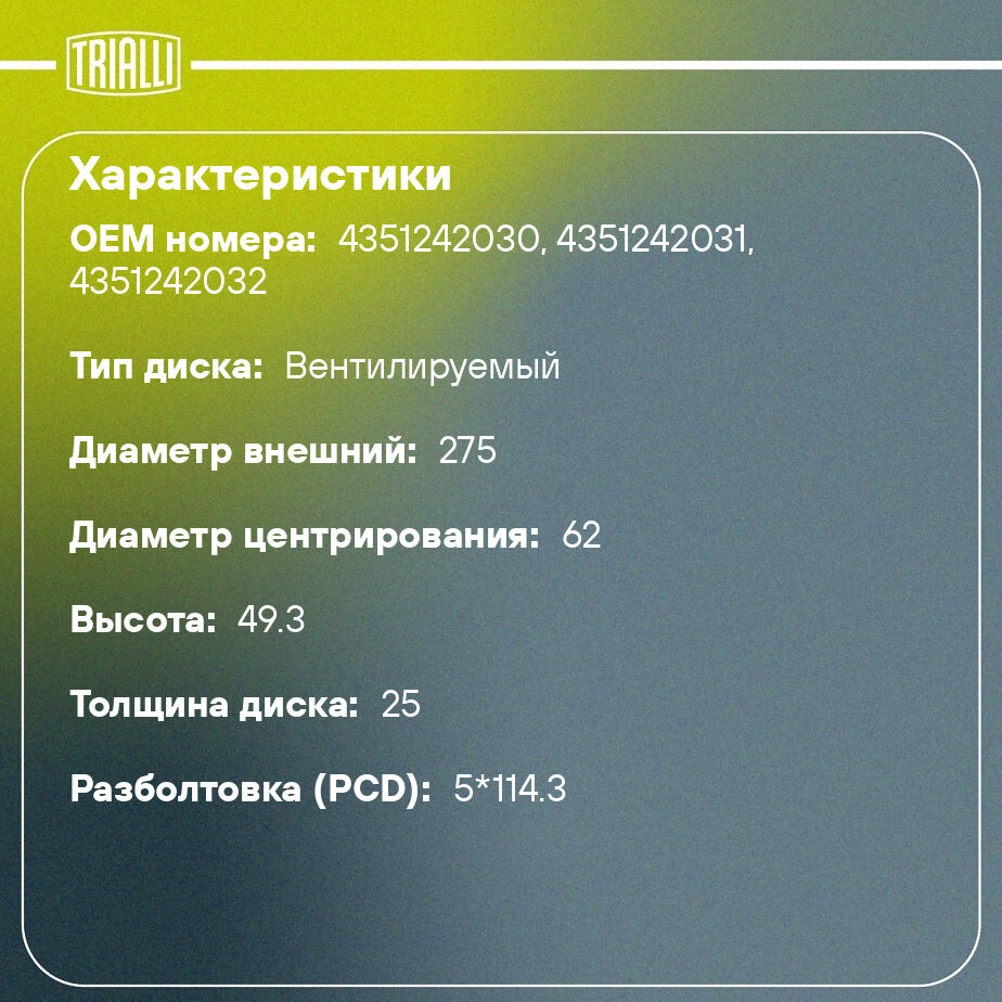Диск тормозной для автомобилей Toyota Rav4 (00-) передний d=275 DF 190403 TRIALLI информация: