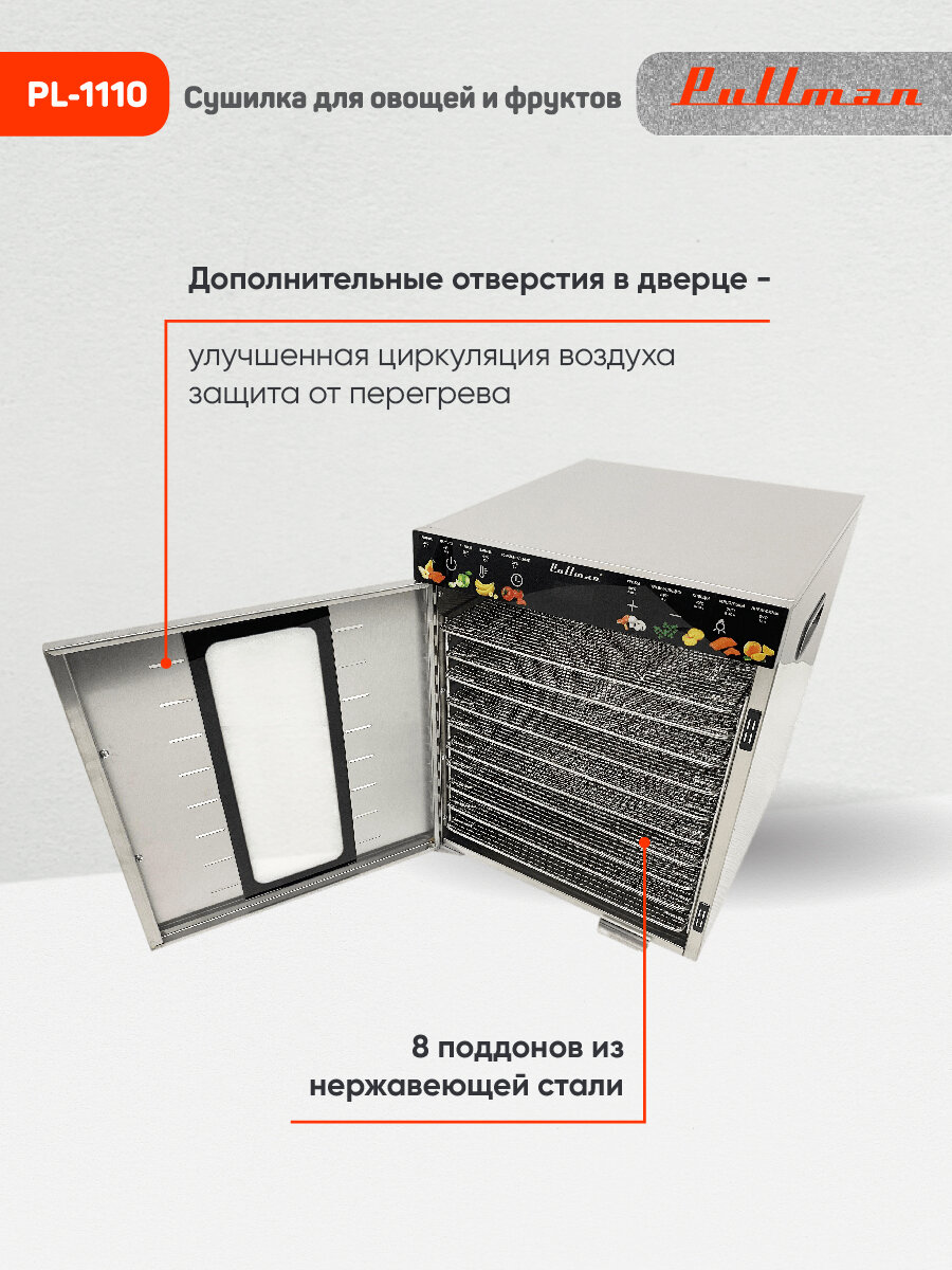 Сушилка для овощей и фруктов Pullman PL-1110, двухслойный корпус дегидратора, 800Вт, 21 поддон, поддоны для пастилы в комплекте информация: