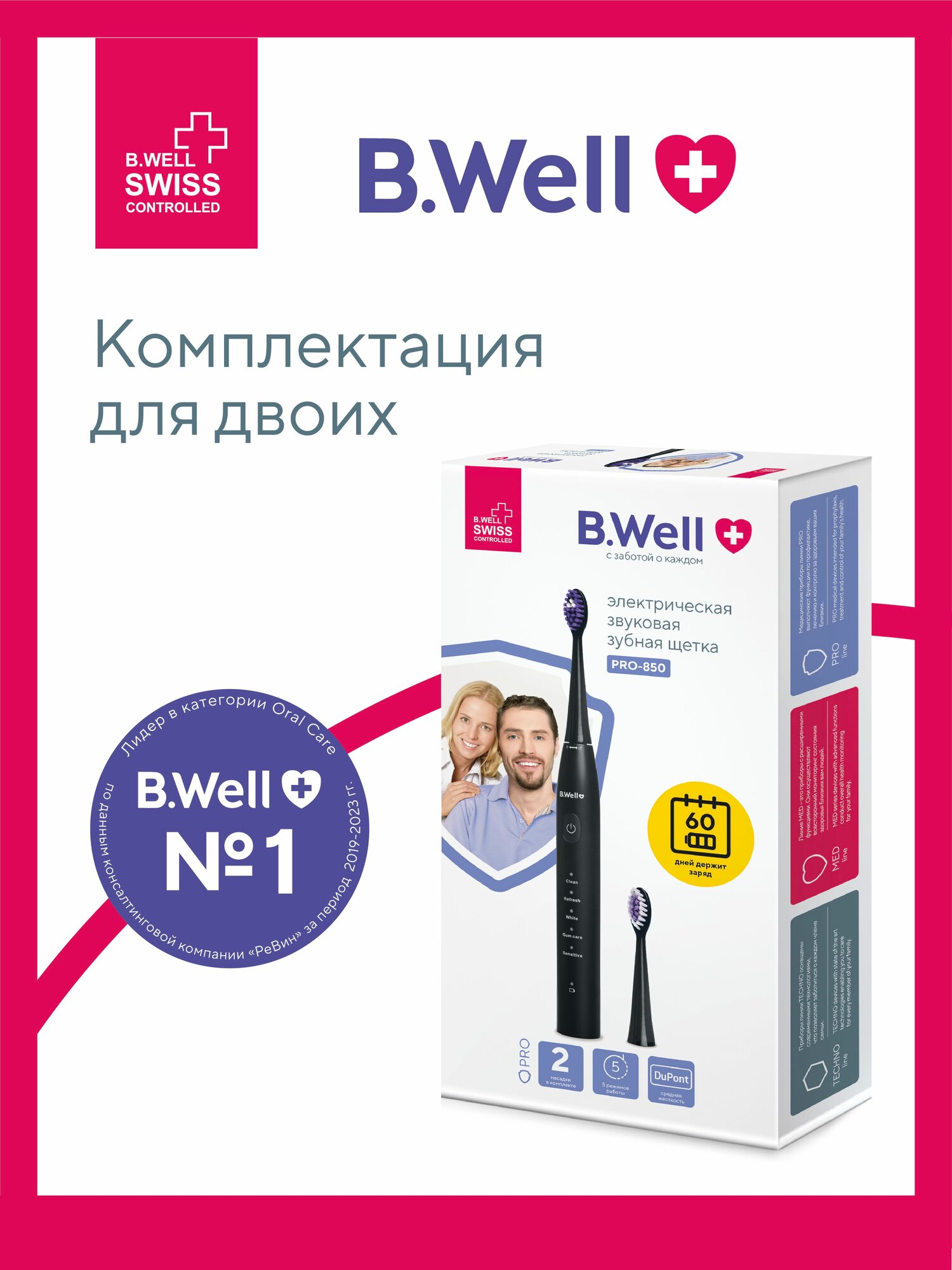 Электрическая зубная щетка B.Well PRO-850, звуковая, премиальная щетина DuPont средней жесткости, 5 режимов, 60 дней без подзарядки, 2 насадки, черная