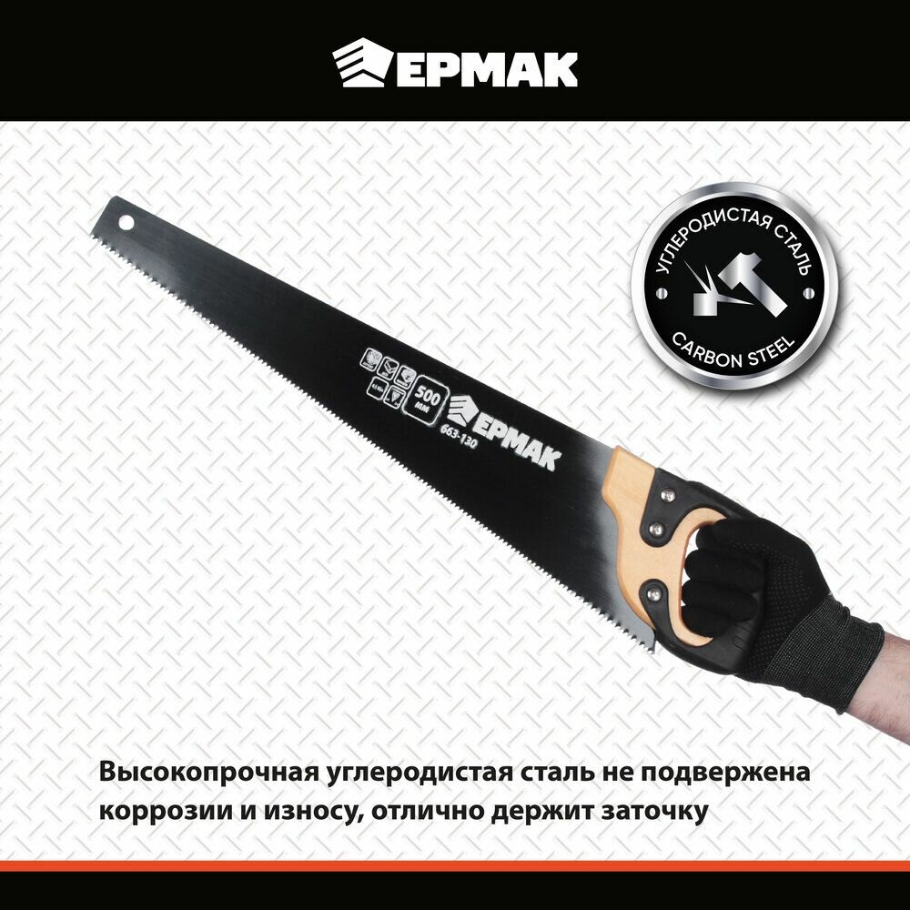 Ножовка по дереву Ермак, 500 мм, с деревянной обрезиненной ручкой, универсальный зуб размером 4 мм информация: