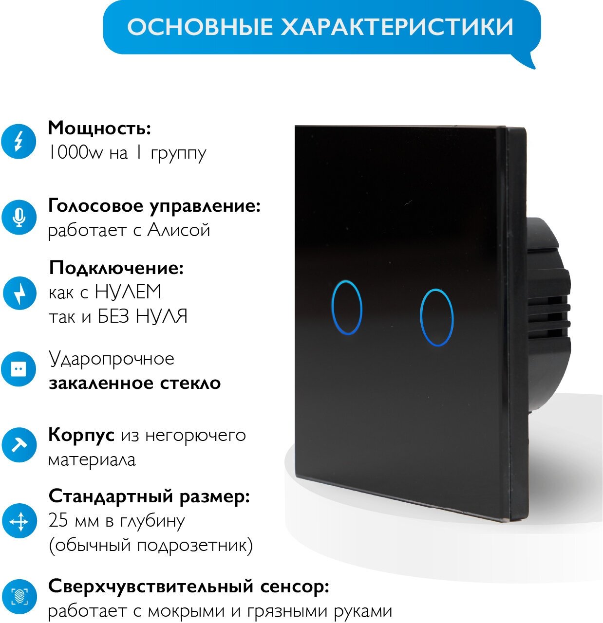 Умный выключатель С Алисой Easy Tech, сенсорный стеклянный двухклавишный, переключатель света 1000W, черный информация: