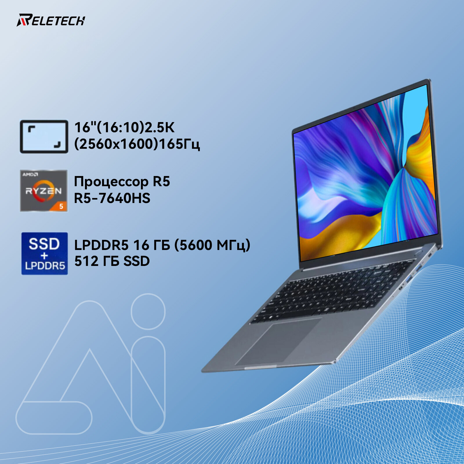 Ноутбук 16" 2.5K 2560x1600 X16 Extreme,AMD R5 7640HS,DDR5 RAM 16GB 5600MHz,512ГБ PCIe3.0 NVMe SSD,AMD Radeon 760M, Reletech Ноутбук информация: