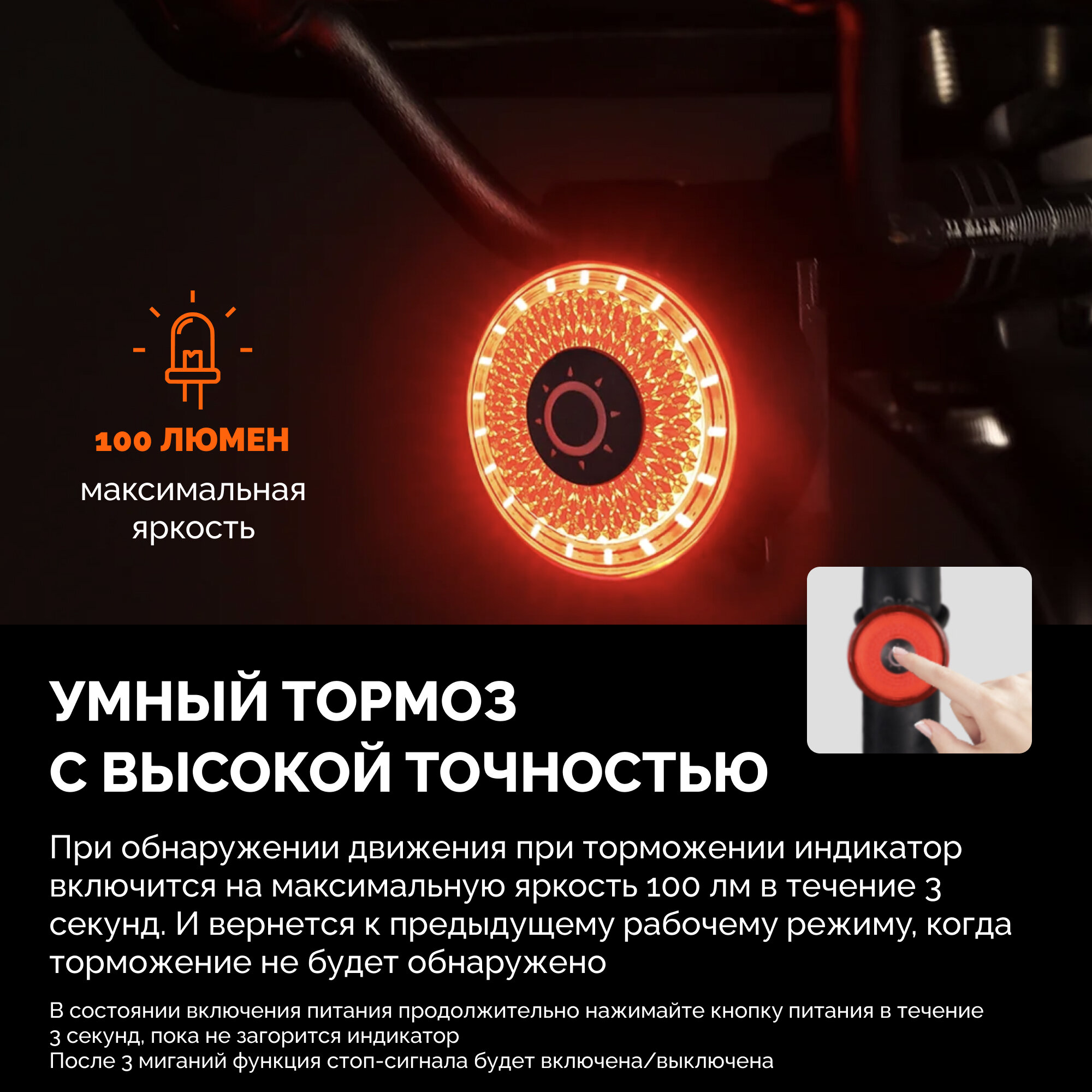 | Особенности | USB-зарядка / влагозащищенный / индикатор заряда / стоп-сигнал |