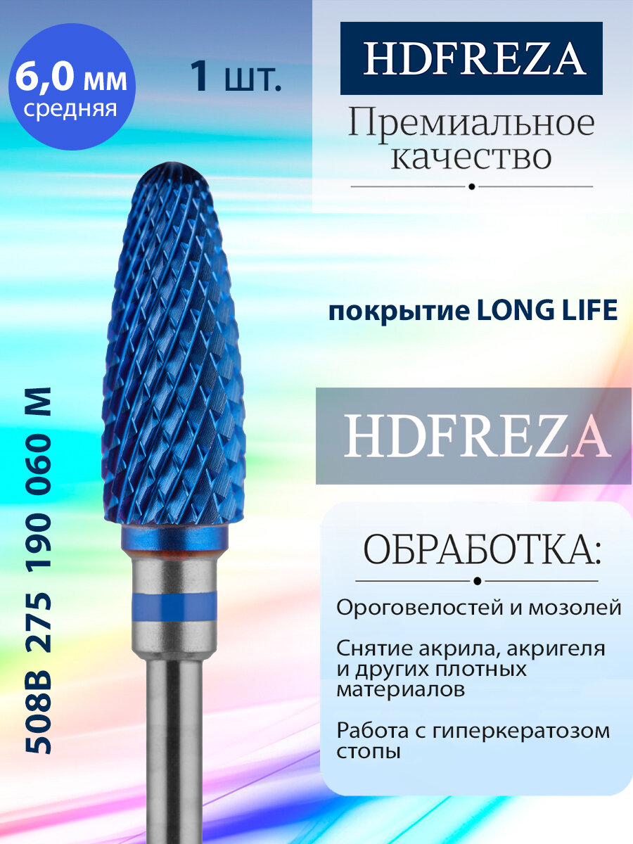 Фреза для маникюра и педикюра HDFREZA твердосплавная для снятия покрытия 508B 275 190 060 M Средняя синяя конус d-6.0 информация:
