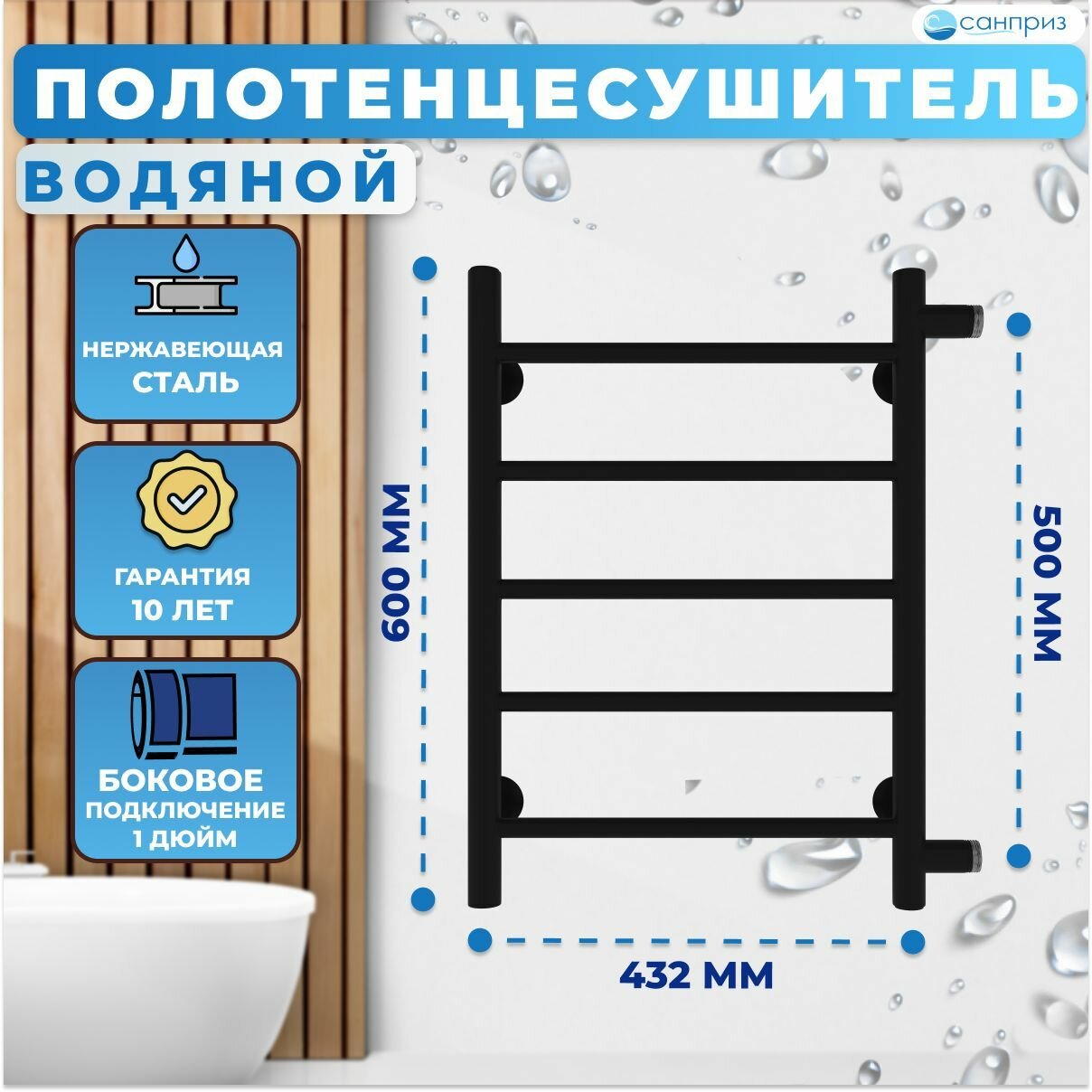 Полотенцесушитель водяной санприз Аврора П5 300мм 600мм боковое подключение м/о 500 черный матовый форма Лесенка 9 946 ₽