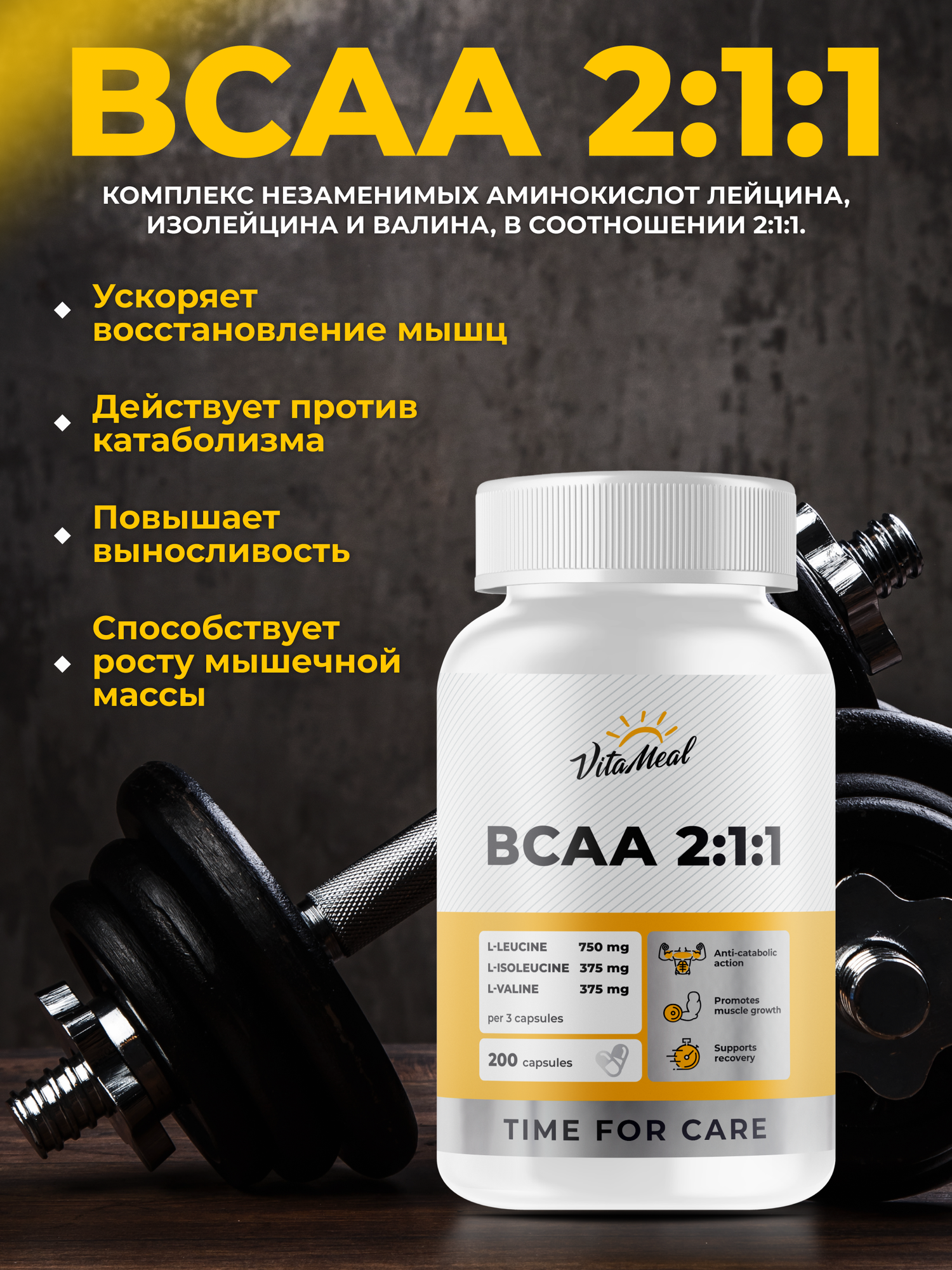 БЦАА в капсулах аминокислоты VitaMeal BCAA 2:1:1, 200 капсул для набора мышечной массы информация: