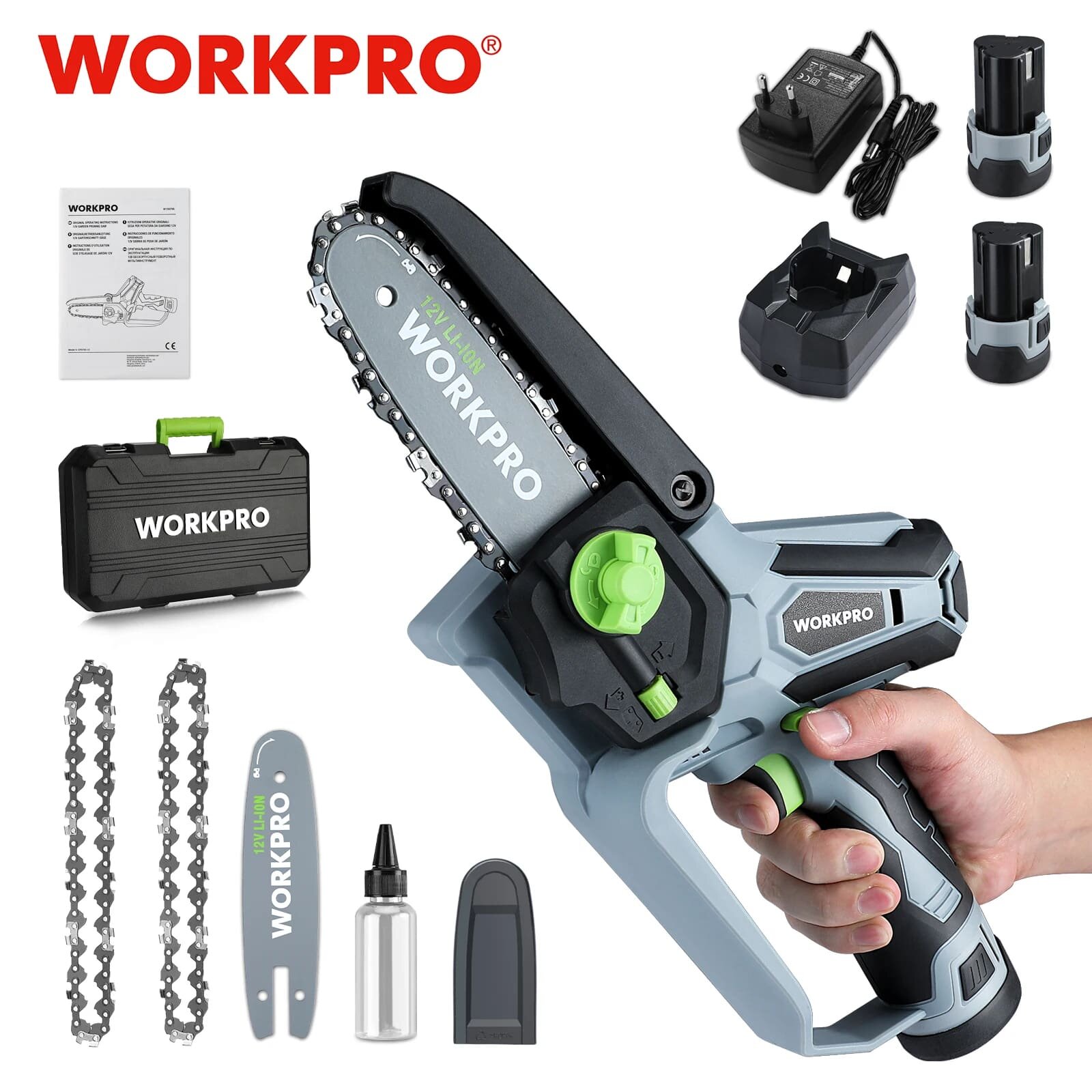 Мини-пила WorkPro, 12В, 2 батареи, 3 цепи, шина 16см, комплект информация: