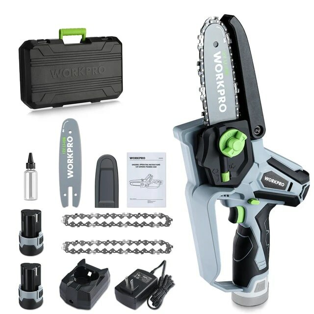Отзывы на Мини-пила WorkPro, 12В, 2 батареи, 3 цепи, шина 16см, комплект