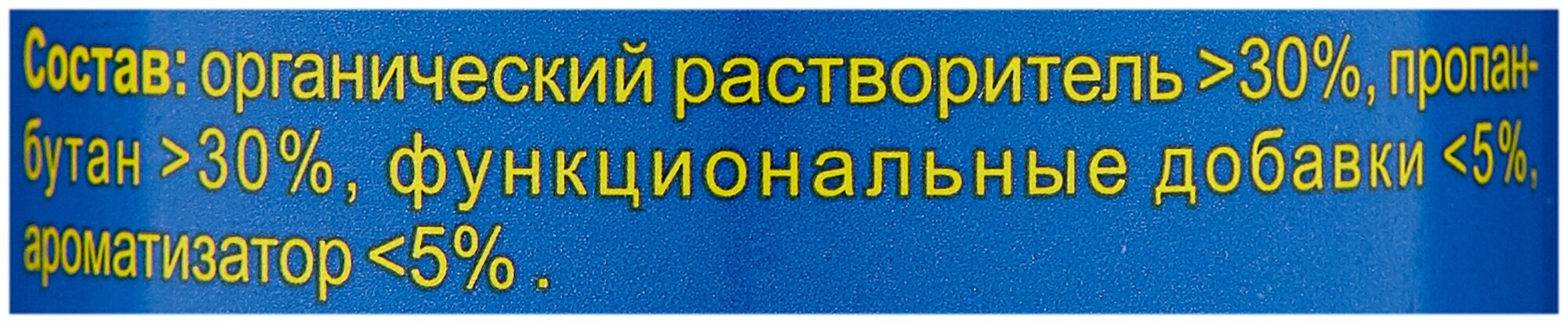| Состав | органический растворитель 30%,пропан-бутан 30%,функциональные добавки 5%,ароматизатор 5% |