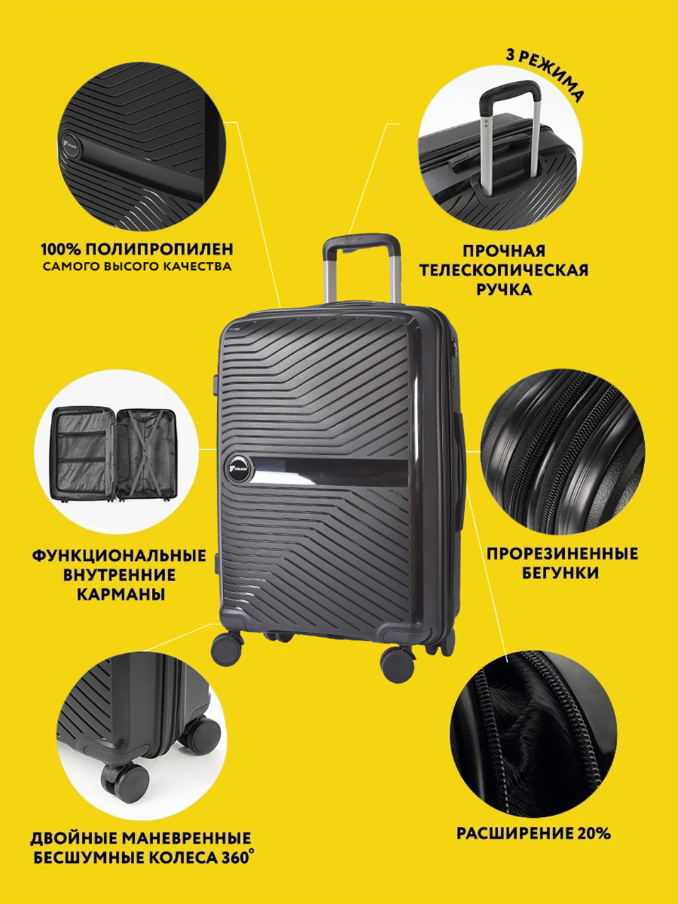 Дорожный чемодан на колесах M маленький, ударопрочный из полипропилена черный 11 550 ₽