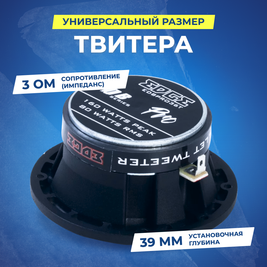 | Дополнительная информация | Автомобильные твитеры EDGE EDBPRO36T-E1 с выдающимися характеристиками обеспечивают очень громкое звучание даже с небольшими по мощности усилителями благодаря высокой чувствительности 103 дБ. |