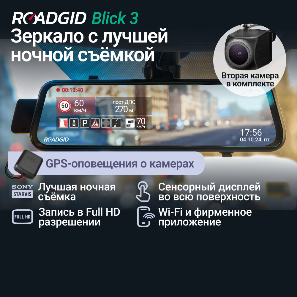 Видеорегистратор зеркало с оповещениями о камерах для автомобиля Roadgid Blick 3 Wi-Fi GPS - с двумя камерами и лучшей ночной съемкой в Full HD информация: