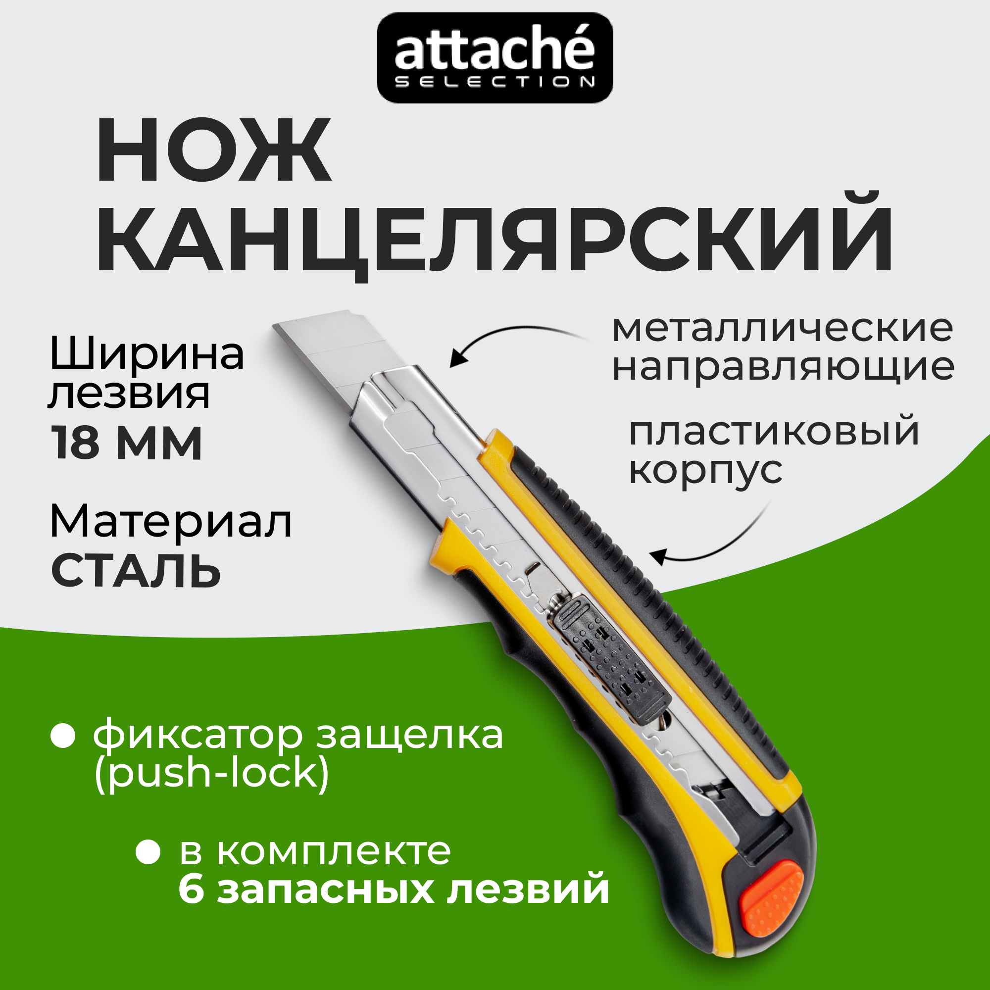 | Дополнительная информация | Нож универсальный Attache Selection с прорезиненными вставками (ширина лезвия 18 мм) в комплекте 6 запасных лезвий |