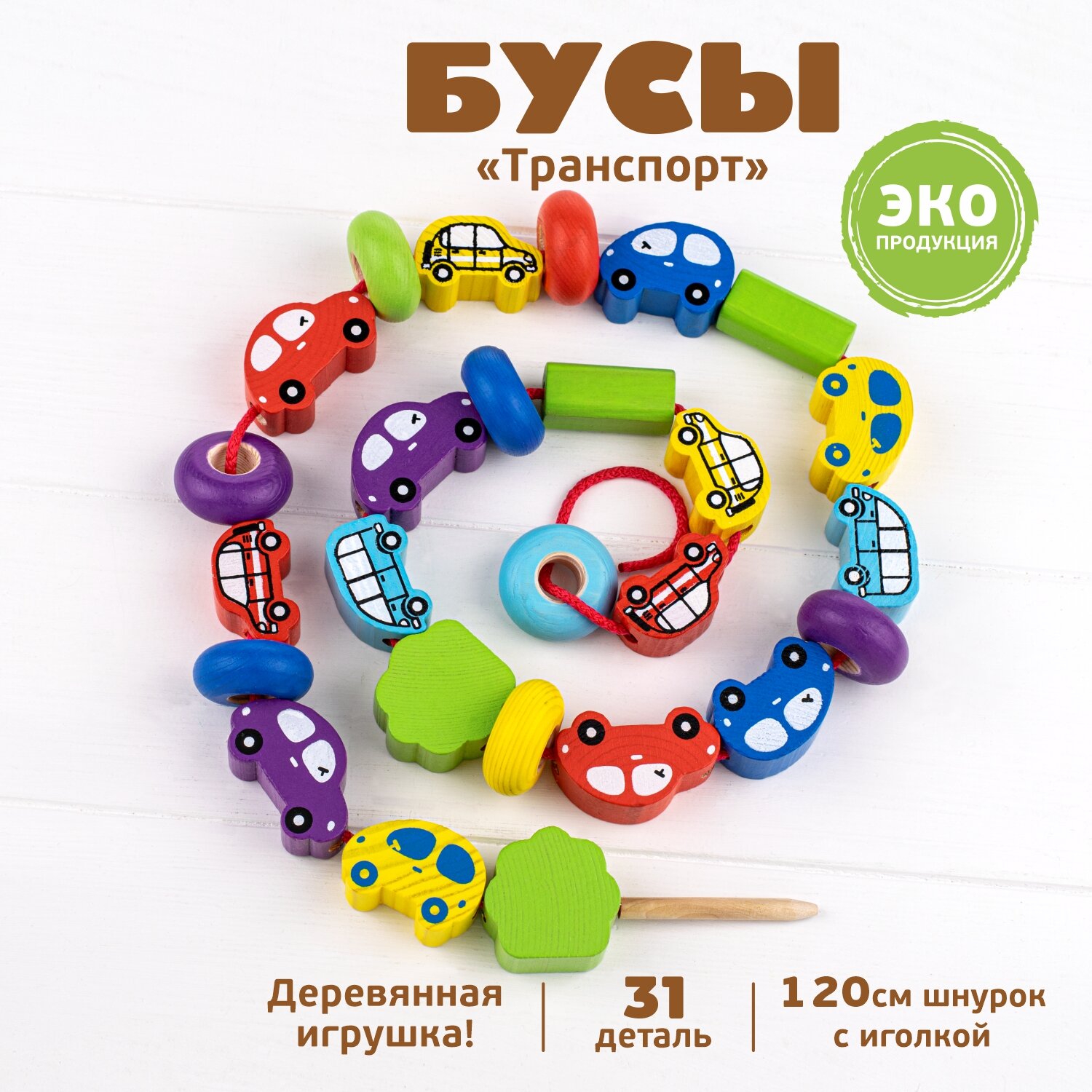 Развивающая игра-шнуровка Бусы "Транспорт", деревянная игрушка для развития мелкой моторики и навыка счета, 31 деталь информация: