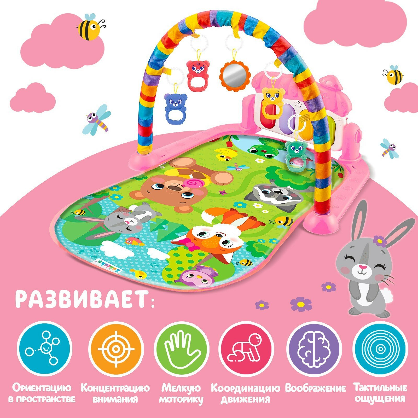Музыкальный развивающий коврик "Милые зверята", игровой центр для малышей, звуковая подстилка с подвесными игрушками-погремушками, пространство для игр и развития, русское озвучивание, цвет розовый 2 023 ₽