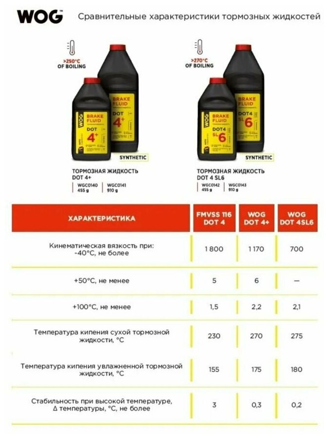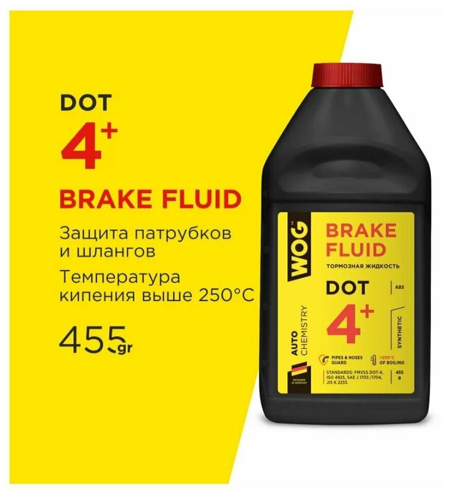 WOG Жидкость тормозная 455гр - DOT 4+, синтетическая для авто с ABS, ESP, TSC и ASC, соответствует: ISO 4925 Class 4, SAE J 1703/1704, JIS K 2233
